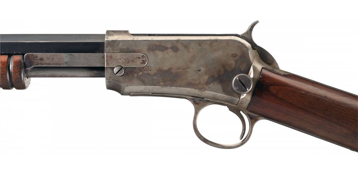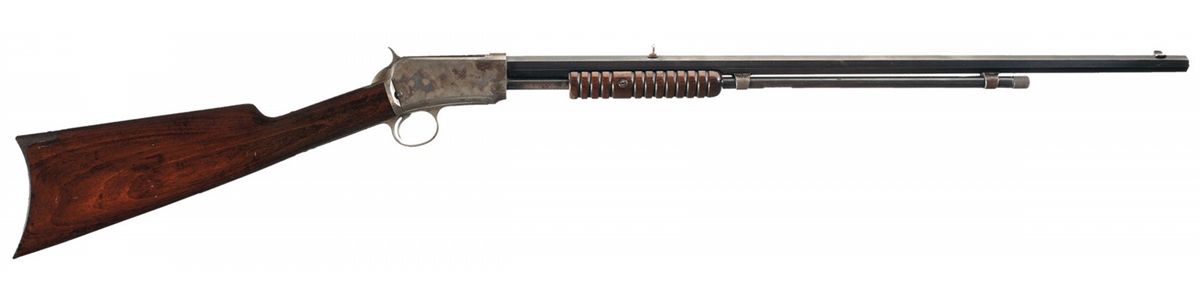 This Second Model Winchester Model 1890 was manufactured in 1894. It has a fixed front blade sight and a replacement fixed semi-buckhorn rear sight. The barrel has the fifth barrel marking including the Nov. 27, 1906 patent date on the left top flat midway down the barrel, the caliber marking on the top left flat near the receiver and the Winchester proof on the top flat at the breech. The top tang is marked with the Second Model tang marking. Mounted on a 12 groove round walnut forearm and straight grip stock with a smooth crescent steel buttplate.