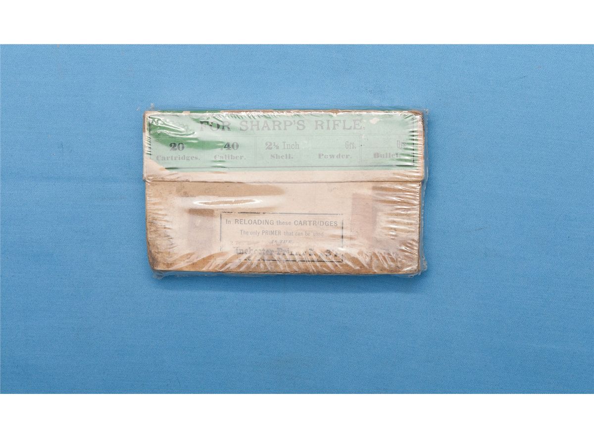 20 count box of center fire 40 caliber cartridges for Sharps rifles manufactured by Winchester Repeating Arms Company. CONDITION: Very good. The box is sealed in cellophane.