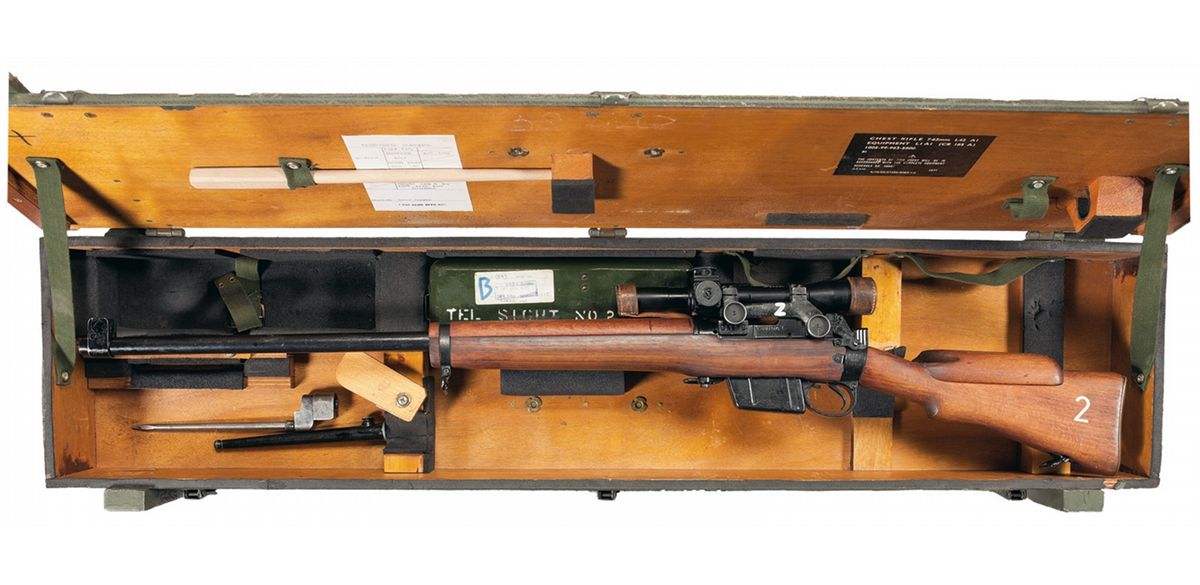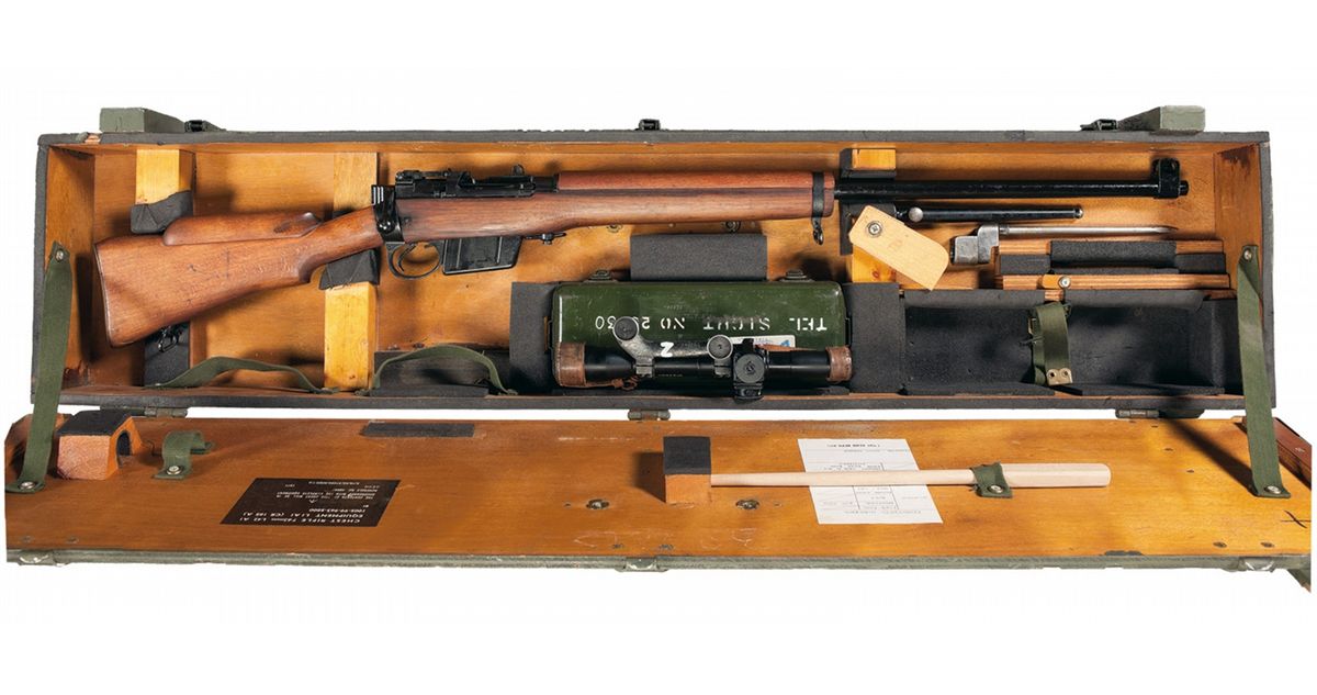 This is a very nice example of a scarce British L42A1 Sniper rifle set. These rifles were developed during the mid-1960s and actually put into service in the early 1970s using the original WWII British Enfield No 4 MK 1 (T) sniper rifle as the basic weapon platform, with the intent to introduce an updated sniper rifle which utilized the new 7.62 NATO round. It is estimated that approximately 900 rifles were converted/produced and approximately 450 were actually imported into the US in the late 1980s early 1990s by Navy Arms, with the rest being destroyed by the British Government. The original WWII rifles were completely rebuilt from the ground up, which included installing a new heavy weight, hammer forged, target barrel, chambered in 7.62 NATO, that included a new high pressure bolt head, (correctly engraved "19 T/0", indicating minimum headspace), and a new box magazine and ejector for the 7.62 NATO round. The original WWII, No 32 MKIII scope was completely rebuilt and calibrated in meters for the 7.62 NATO round. The old scope markings were just lined out with the new NATO markings of "1240-99-962-2063"/"TELSTRT.STG.L1A1"/"N25530" engraved on the side of the scope tube. The left side of the butt socket still retains the original WWII markings of "M47C,/1945/T32632/TR" and the left side of the receiver has the new markings of "L42A1/D71.T". The original scope mount has been reused/renumbered twice (with matching serial number to the rifle) which would be correct for these rifles as they were all original WWII models that were used over and over, because no new mounts were ever manufactured. The buttstock and hand guard are both made of beech with the forend made from walnut. The rifle is complete with only the original cheekpiece, the original WWII British metal scope can (numbered to the rifle and scope) and original green painted wooden storage chest, (that has an end label numbered to the rifle). The chest has a hinged lid, three latches, two canvas carrying straps and metal corner protectors. The inside of the lid has one affixed label, that reads "CHEST RIFLE, 7.62mm L-42 A1/EQUIPMENT LIAI (CR 185 A)". This lot is complete with a No 4 spike bayonet and scabbard and a reproduction chamber cleaning rod and a set of original British leather scope caps.
