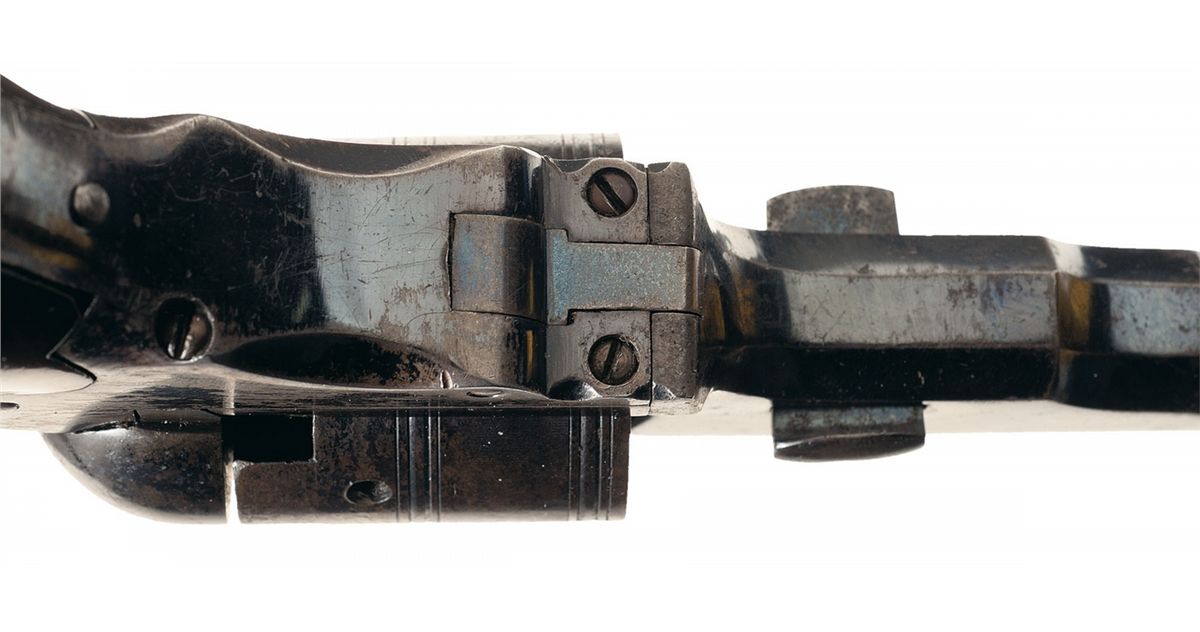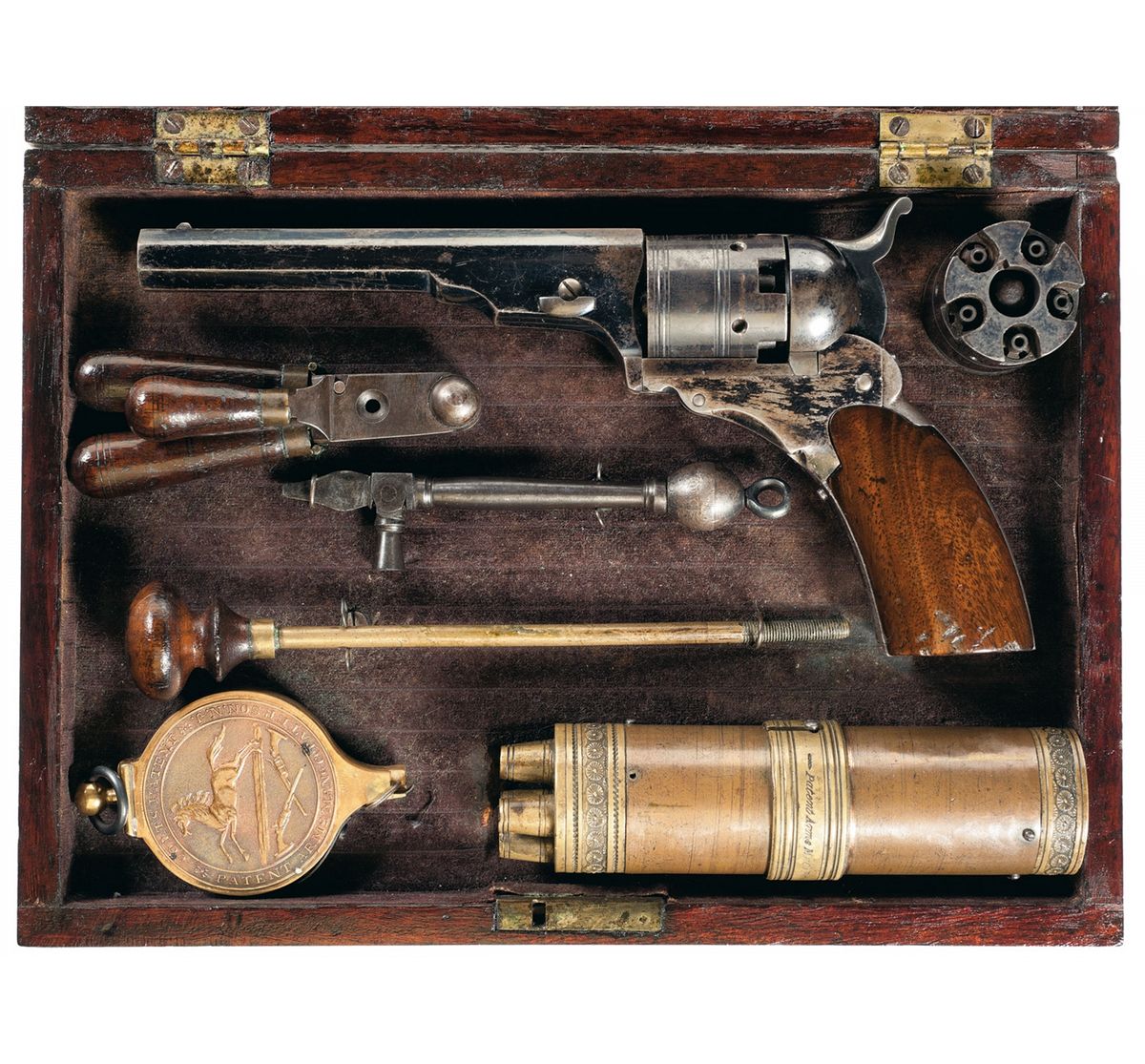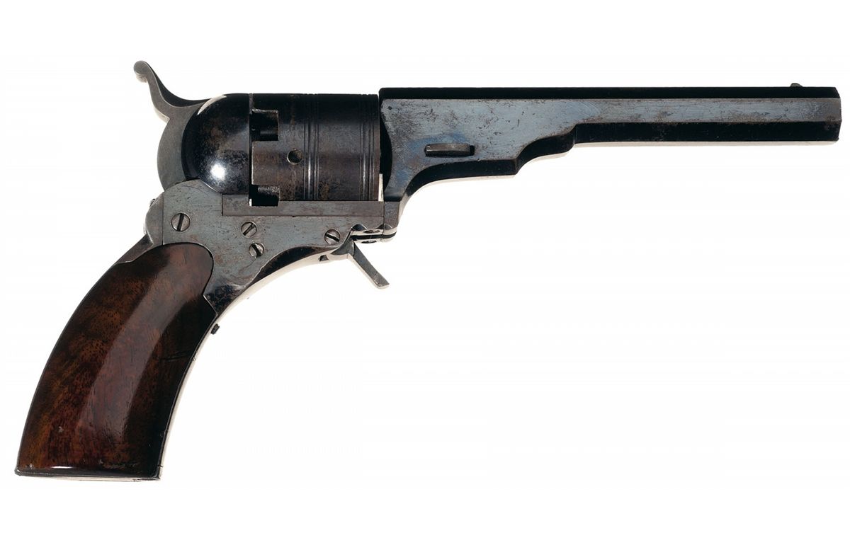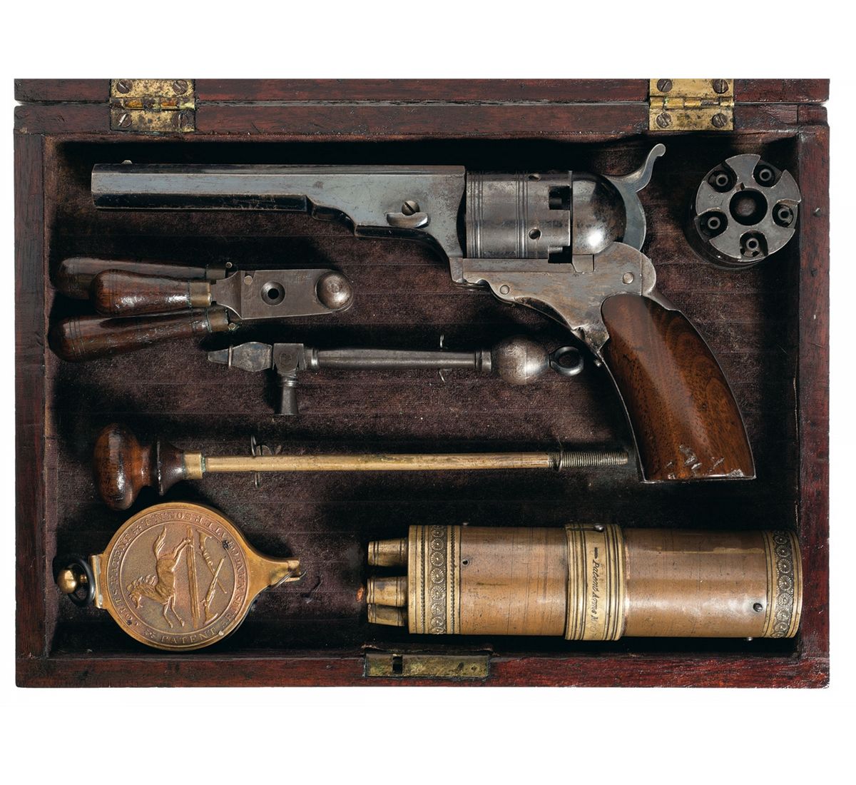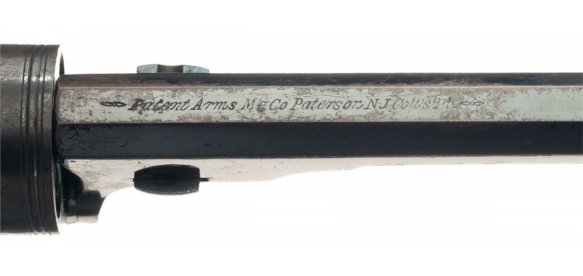 This is a highly sought after example of a Colt Belt Model Paterson Revolver No. 2 with the original factory case and accessories. Colt manufactured approximately 850 Belt Model No. 2 revolvers at the Paterson, New Jersey, factory between 1837 and 1840. Experts believe that fewer than 250 of these revolvers still exist today and only a small number retain the original factory cases. The revolver has a high polish blue finish on the barrel, cylinder, frame, grip straps and hammer. The straight grips are highly figured walnut with a high polish 'piano' finish. The five-shot, square back, cylinder is roll engraved with the centaur hunting scene. This No. 2, Model C, revolver has the distinctive square-back cylinder, flared barrel lug, double curve barrel lug, flat butt and is in the correct 100-200 serial number range. The top of the barrel is roll-stamped: "-Patent Arms Mg Co Paterson N.J. Colt's Pt.-" with small arrows at either end of the legend. The serial number, "185", is visible on the rear of the barrel lug, the wedge, the rear face of both cylinders, on the left side of the trigger, on the cylinder plate in the trigger slot and on the bottom right edge of the grip. All of the visible serial numbers match. The revolver is complete with a Colt factory case with accessories. The rectangular, varnished mahogany case has a beveled lid inlaid with a silver plate with scalloped edges. The case interior has a ribbed, brown velvet lining and is fitted with wire retainers to secure the accessories. The case contains the distinctive Paterson accessories that include: (1) a spare five-shot square back cylinder with matching serial number "185", (2) an iron single cavity round ball mold with wooden handles on both blocks and the spruce cutter, (3) a Paterson No. 2 combination tool that incorporates a ball seater, screw-driver, nipple wrench, and nipple pick, (4) brass mounted charger for a Belt Model No. 2 revolver numbered "54" on the bottom and on the sides of both compartments and (5) brass cleaning rod with a turned walnut head.