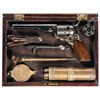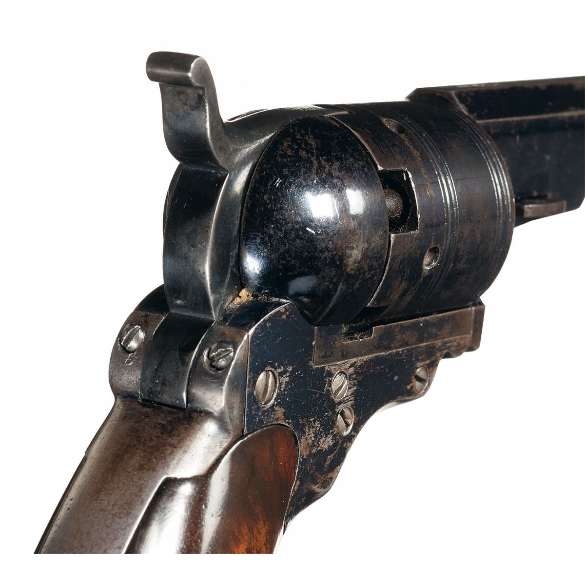 Condition: Very fine as possible factory refurbished. The pistol retains nearly 90% of the high polish blue finish on the barrel, frame and cylinder. The barrel, frame and cylinder have scattered edge wear and the grip strap and backstrap have aged to a silver-gray patina. The grips have been re-finished but remain in very good condition. The hammer appears to be an expertly executed replacement. The barrel markings are sharp and the cylinder scene is at least 90% complete. The action is crisp and functions well. The case exterior is in very good condition with moderate handling wear. The brown velvet case lining is in good overall condition. The lining shows some large compression and oil stains, The spare cylinder has some scattered and very light pitting near the rear face. The iron bullet mold blocks and spruce cutter have faded a smooth, brown patina and the wooden handles remain in very good condition. The combination tool has a gray patina and is fully functional. The charger shows moderate wear and has crisp markings and a mellow age patina on both the brass and copper components. The cleaning rod has an attractive age patina. The capper is a modern reproduction.The Colt Paterson revolvers are historically important and rare in any condition. This is one of a handful of Belt Model Paterson No. 2 revolvers in high condition with the original case. No advanced Colt collection is complete without an example of a Colt Paterson Model revolver.