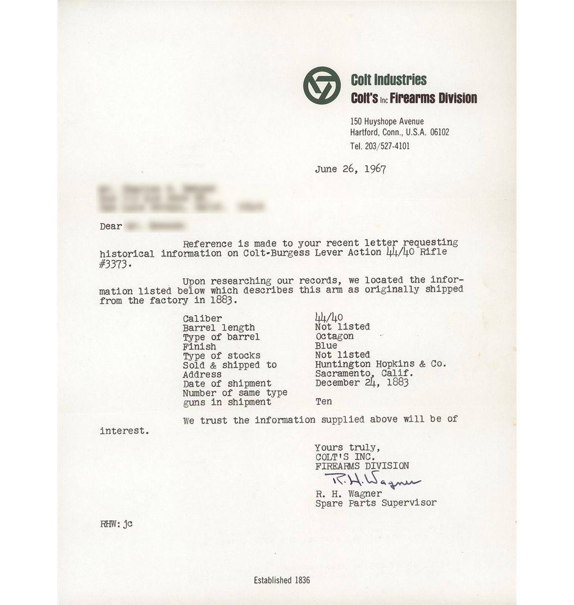 Factory letter confirms caliber, octagon barrel and finish with barrel length and type of stock not listed. Shipped to Huntington Hopkins & Co., Sacramento, CA on Dec. 24, 1883.