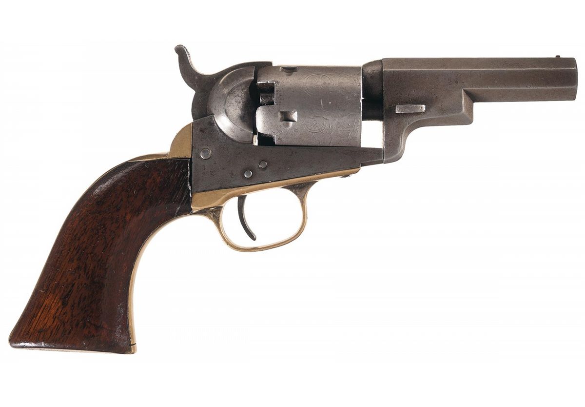 Manufactured in 1856. Has a three-inch octagon barrel with no provision for a loading lever and small round trigger guard, in the correct 113,000-119,000 serial range for the "Wells Fargo" Model 1849 revolvers without loading levers. The top barrel flat is marked "{ADDRESS SAML COLT/NEW YORK CITY}", cylinder is roll-engraved with the stagecoach holdup scene and "COLTS PATENT/No. 114952" and the frame is marked "COLTS/PATENT." Serial number on barrel, frame and back strap. The trigger guard has the number "14952" with the first "1" of the serial number missing, possibly a factory error. The barrel wedge and arbor pin are numbered to the gun. Fitted with a varnished grip.