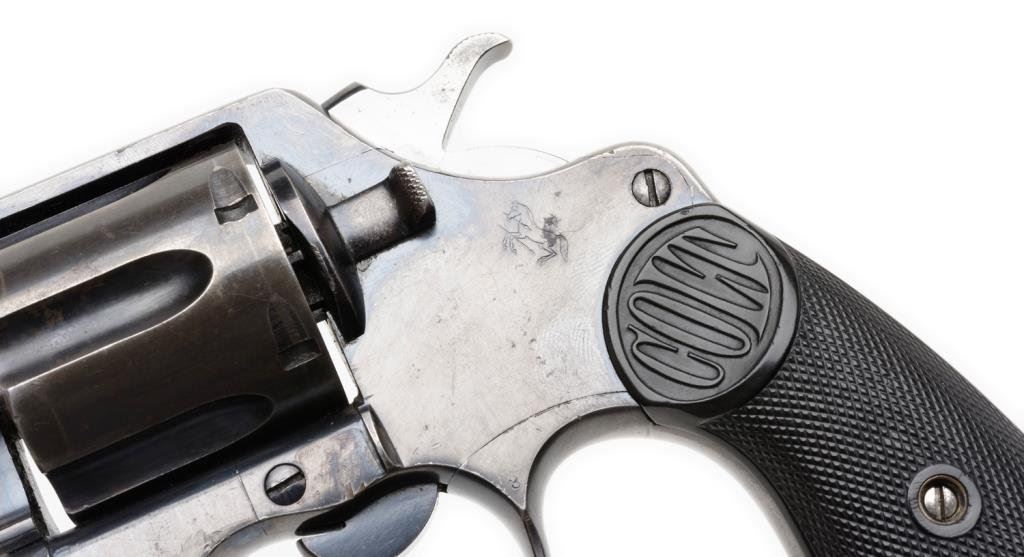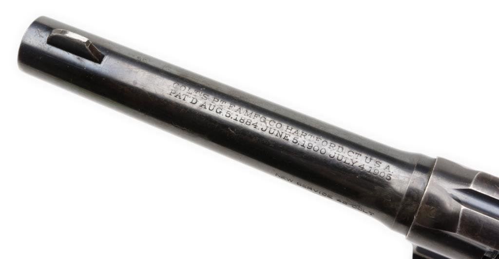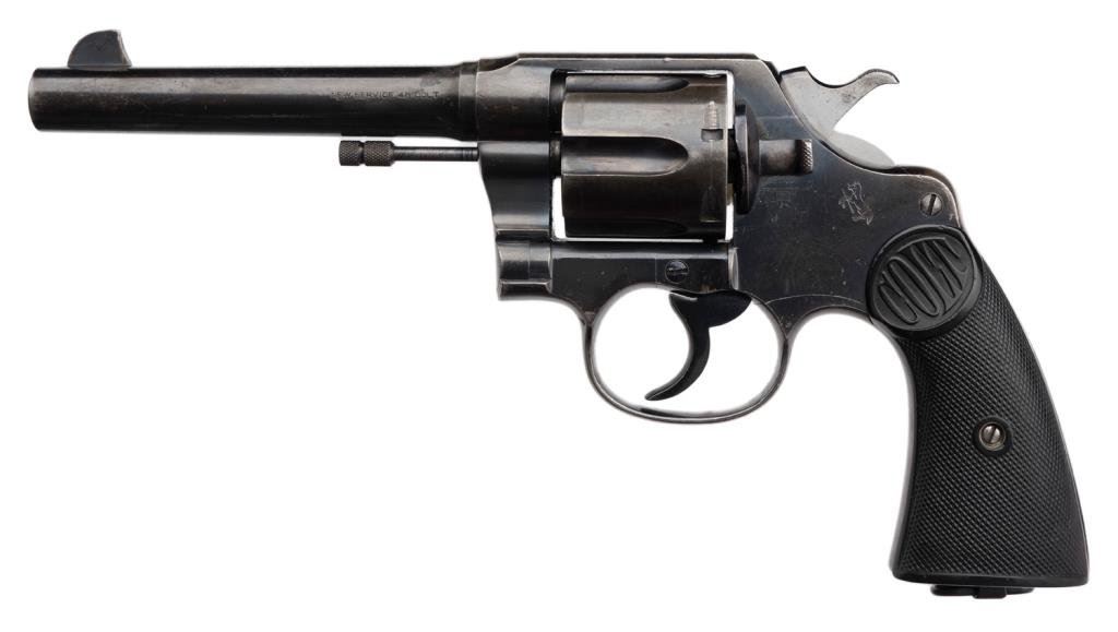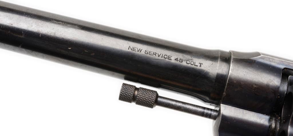 Desirable Colt New Service DA revolver, .45 Colt caliber, 5.5” round barrel, S/N 146837, blued finish, checkered black hard rubber grips, back strap stamped “RNWMP 1670” and butt strap is stamped “MP”; lanyard ring present. This Royal Northwest Mounted Police service weapon is in overall very good to fine condition displaying the majority of its original blue finish with thinning of the finish on the back strap from handling; the action and markings are crisp, the bore is very good +. Accompanied by an original factory letter confirming caliber, barrel length and finish (Type of stocks “Not Listed”). Shipped to the Commissioner, Royal Northwest Mounted Police, Canada on October 8, 1919 in a shipment of 200 same type guns. Est.: $1,750-$2,750.