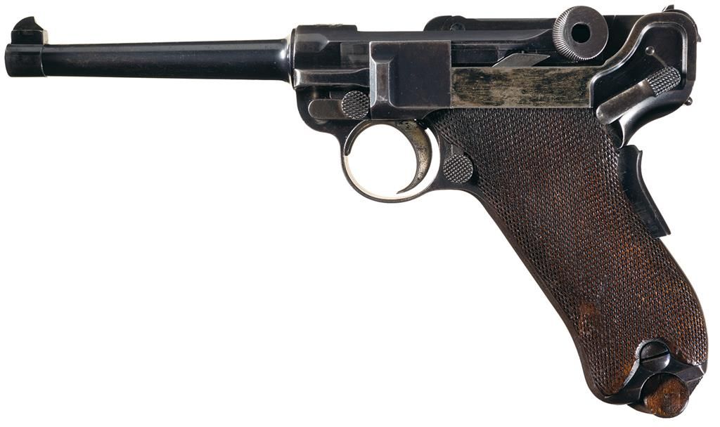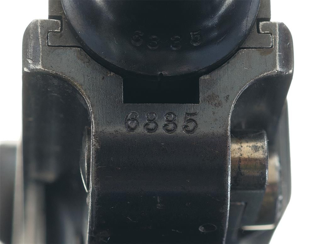 This is a solid representative example of a scarce DWM Model 1900 American Eagle Test Luger that was purchased in August 1901 by the U.S. Ordnance Department for troop trials with the U.S. Cavalry. In April 1900 the Ordnance Board authorized an order for 1,000 DWM model 1900 Luger pistols, which were delivered in two separate lots. Approximately 800 were shipped 26 October 1901 (serial numbers approximately 6,100-7,100 range) and the remaining 200 shipped on Oct 29 1901 (serial numbers in the 7,200 range). This scarce pistol is serial number "6335" and falls well within the known U.S. Test Eagle serial number ranges. These early American Eagle Test Lugers were developed expressly for the U.S. military when they were interested in selecting a replacement pistol for Colt 1894 revolver chambered for the anemic 38 caliber. There were only a total of 1,000 of this model ever manufactured as standard 1900 commercial Lugers with all of them being hand selected at the DWM factory for shipment to the US Army. These Lugers are highly sought after by both German Luger collectors and US Martial handgun collectors. The distinguishing features of these rare "Test/Trials" American Eagle Lugers are: 1) there are no German acceptance proofmarks, 2) they lacked the typical Germany export markings usually found on the front of the frame or under the barrel, 3) some but not all had a small German ordnance proof that resembled the U.S. Ordnance bomb proof located either inside the front frame recess area, of in front of the recoil lug located on the underside of the barrel extension (this example has both) and/or on the bottom of the wooden magazine base, (which this magazine is not marked) and the last two digits of the serial number were stamped on the rounded portion of the opposite side of the takedown lever, (which this example has). At the conclusion of these tests all these Lugers were deemed inadequate for U.S. military use and they were all later sold to Bannermans for resale. The top of the chamber area is correctly marked with the "American Eagle", seal of the United States and are correctly serial numbered in the commercial fashion. They have the early grip safety, recessed breech bolt, dished toggles with toggle locks on the side, and were numbered with the full serial number located on the front of the frame and underside of the barrel with the last two digits of the serial number on the face of the recoil lug, take down lever, side plate, breech bolt, toggle assembly, side of the grip safety and the back side of both grip panels. Originally these pistols had a deep rust blue finish with the heat blue grip screws, front sight blade, and connecting pins. The ejector, toggle link, ejector, takedown lever, trigger, magazine release, and thumb safety lever have a straw color finish. It is fitted with walnut checkered grips and it has a nickel plated magazine body with an unmarked wooden base.