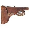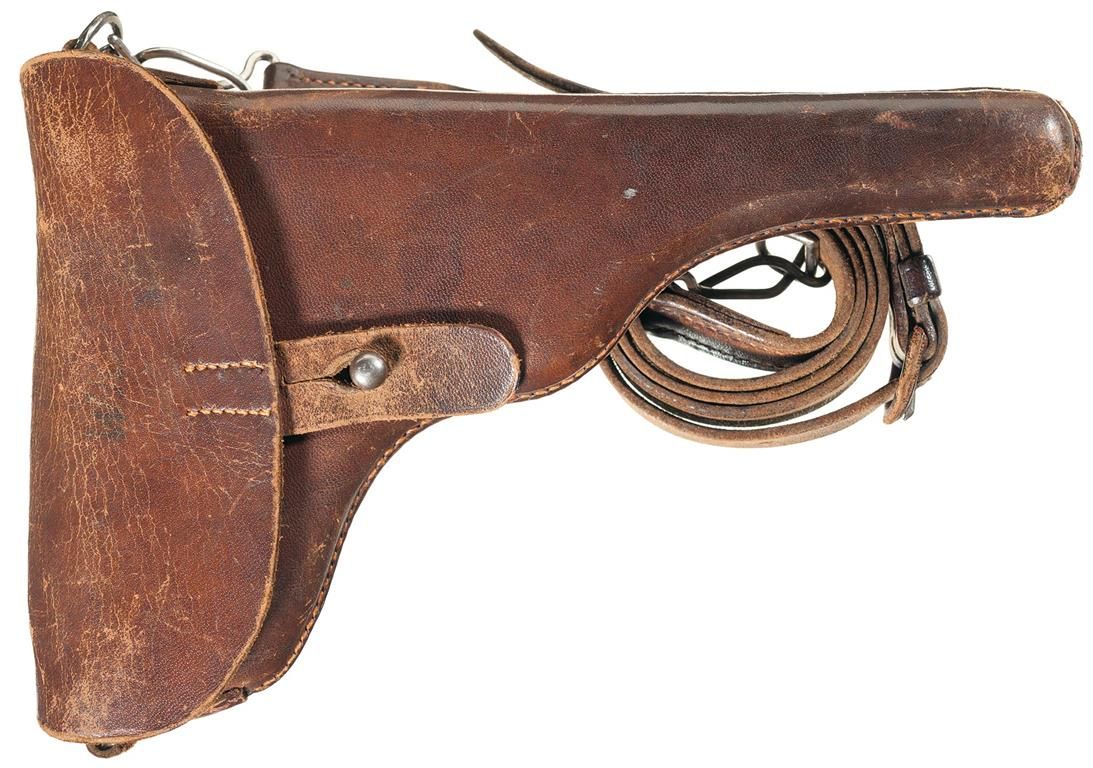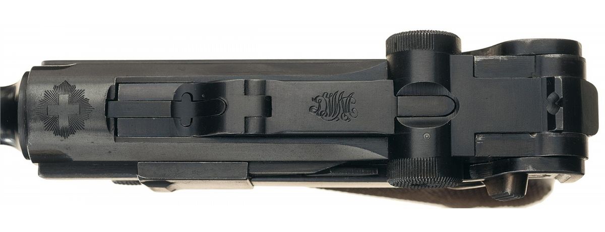 This is a very nice example of an early Swiss Commercial Luger that falls within the serial number range and letter suffix (i) of those sold by the Abercrombie and Fitch Co. in New York. These were early commercial Lugers intended for sale in Switzerland, however with the huge early demand in the U.S., DWM diverted a small quantity from the Swiss contract to their U.S. agent; Abercrombie & Fitch Co. in New York. Although not specifically marked, this early Luger does have the short frame, 1906 style grip safety, no stock lug and is correctly marked "GELADEN" on the extractor, with the first pattern, polished lower safety area on the frame. The chamber is marked with the standard "Swiss Cross in a Sunburst" which indicates a commercial contract Luger and the front toggle has the DWM markings. The front of the frame stamped with the serial number "2879i", with "2879" stamped on the barrel and barrel extension with the last two digits "82" stamped on the small parts. It is complete with an unmarked nickel plated magazine with an unmarked wooden base. It is complete with a unmarked Swiss military style, brown leather holster with the original shoulder straps.