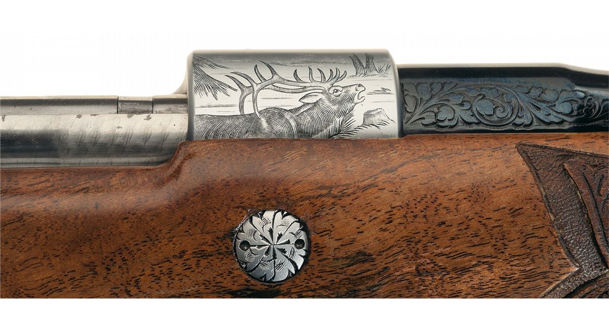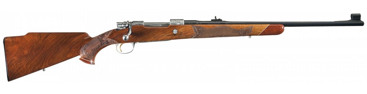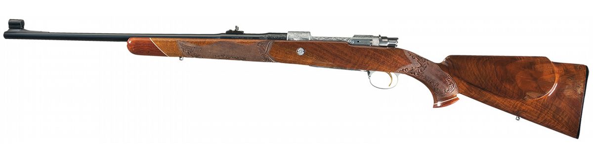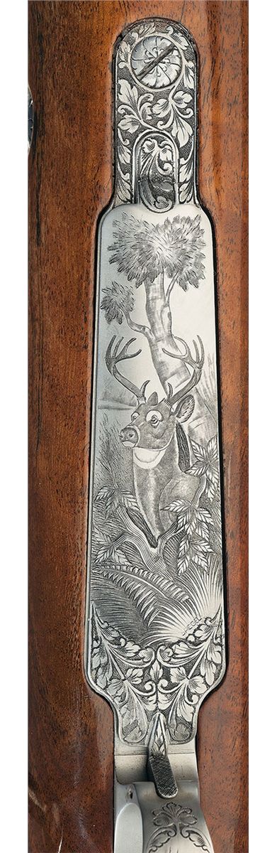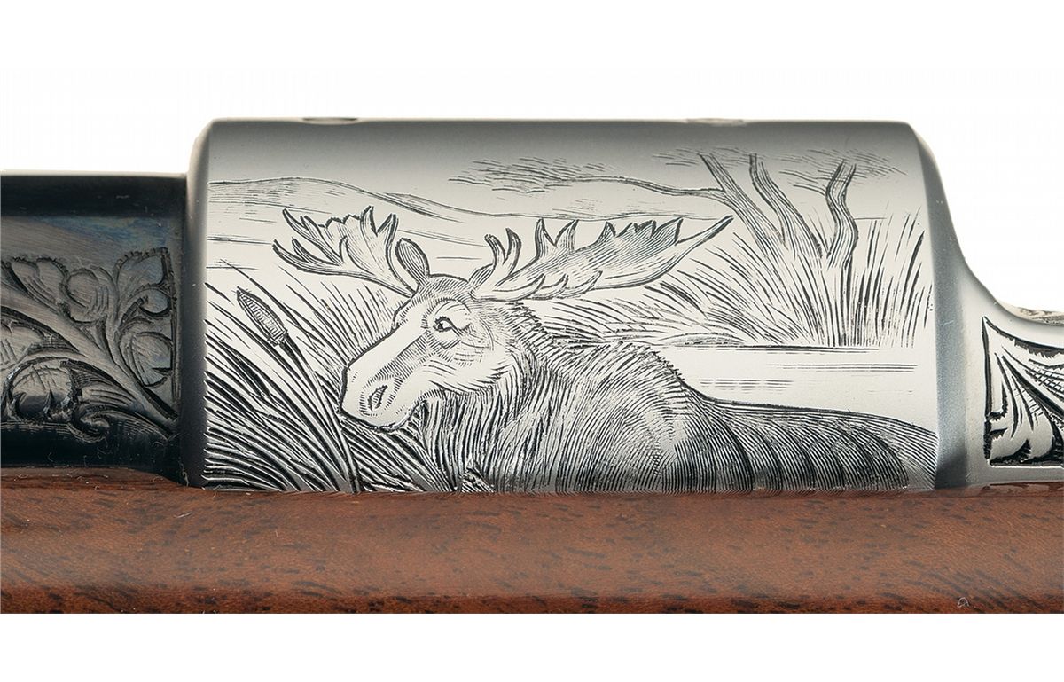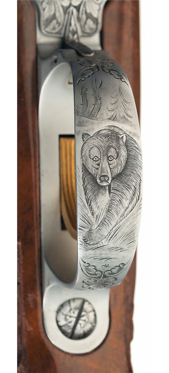 Manufactured in 1967. Hooded ramp front and adjustable leaf rear sights and French gray finish on the remaining parts. The follower and bolt assembly are polished, the extractor is jeweled, and the trigger is gold washed. The front receiver ring is engraved with a bugling elk on the right side, a moose on the left side and the remainder of the action is relief floral vine leaf and punch dot engraved. The serial number is marked on the right rear of the barrel. The hinged floor plate is engraved with a buck in a wooded scene with floral leaf engraving below and on the attaching metal and signed "SPIEGEL" below the buck. The trigger guard is engraved with a bear with a floral leaf pattern above and below and signed "DR" below the bear. There is a two inch wedge of floral leaf engraving on the breech end of the barrel sides. The screw heads and stock bolts are also engraved with a leaf design. The stock is extra fancy select walnut with a high gloss finish, fine line checkering and floral and punch dot hand carving on the forearm and grip area, contrasting forend and grip cap with a diamond shaped brass monogrammed inset on the grip cap, raised comb, cheekpiece, plastic Browning buttplate and sling swivel studs.