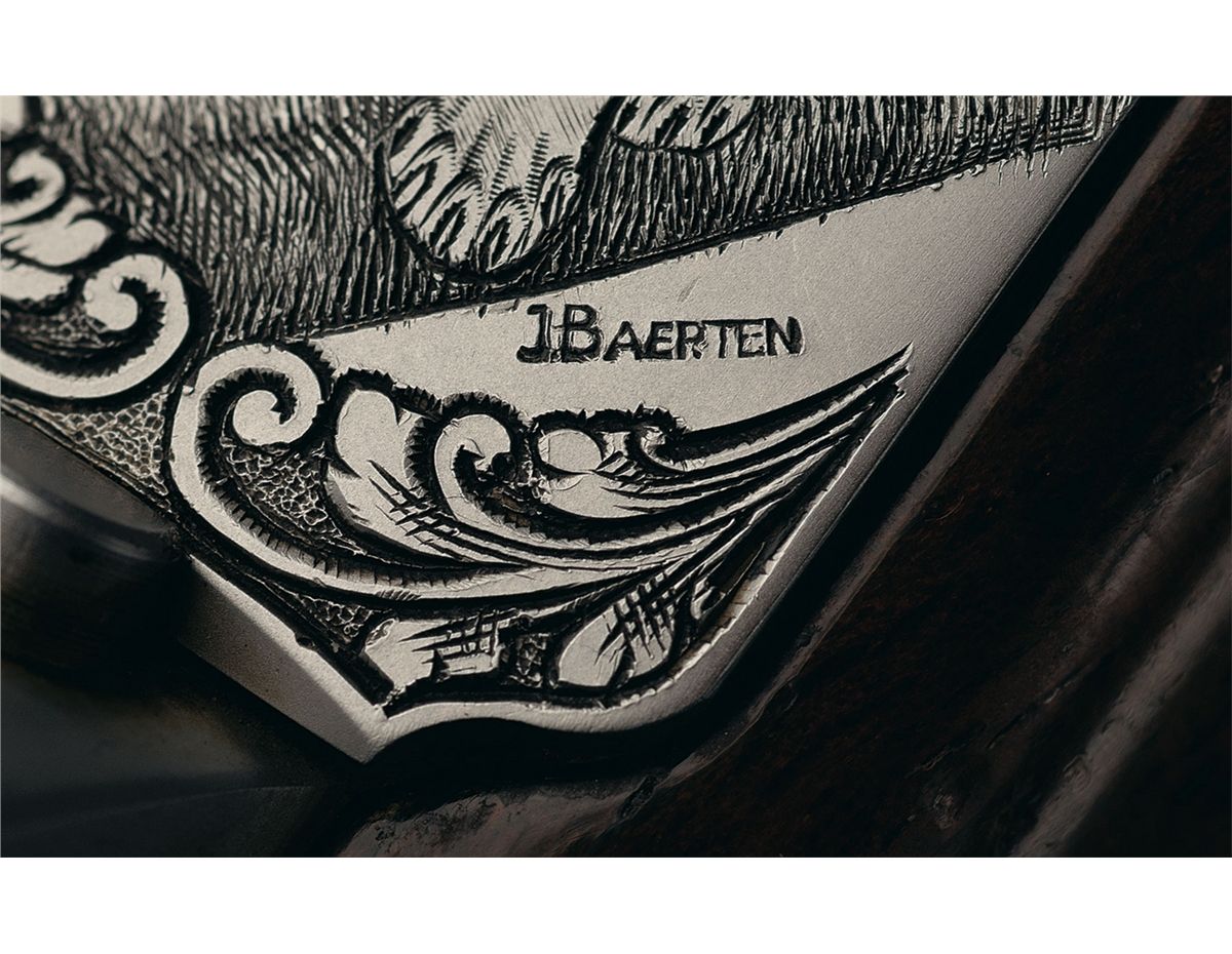 The included Browning factory letter confirms Olympian grade, caliber and light weight barrel without sights. The rifle was manufactured in Belgium and sold for $493.38 on December 10, 1970 to Cullem & Boren Co., Dallas, Texas. The barrel is blue, the trigger is gold, the bolt and follower are polished, the extractor jeweled and the remaining parts are a French grey. The breech end of the barrel has a 2 inch floral scroll and punch dot engraved wedge on each side. The front receiver ring is engraved with a running pronghorn antelope in a plains scene on the right side, a white tail buck on the left side and the remainder of the action is scroll leaf and punch dot engraved. The hinged floor plate is engraved with a mountain lion in a tree with floral scroll engraving below and on the attaching metal and is signed "J. BAERTEN". The left side of the receiver is signed "R. GRECO." The trigger guard is engraved with a mountain goat in a mountain scene. The stock is extra fancy select walnut with a high gloss finish, fine line checkering and floral and matte hand carving on the forearm and grip area. The stock has contrasting forend and grip cap, a raised comb, cheekpiece, Pachmayr recoil pad and sling swivel studs.