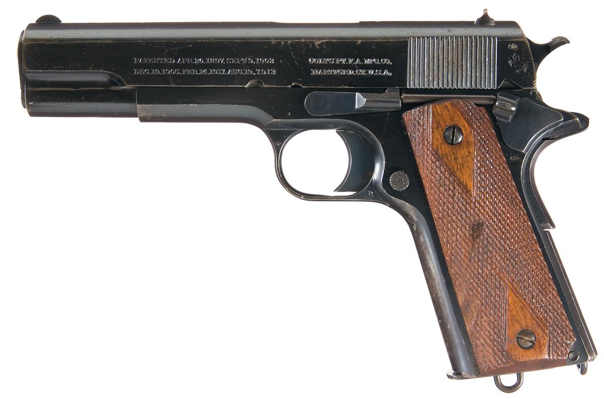 This is an excellent example of early production Colt Government Model semi-automatic pistol with the early style British proofs. During this time frame Colt was producing some of the best automatic pistols, with all of them exhibiting excellent fit and finish, with that Colt pre-war high luster, blue finish, with fine tuned trigger pulls. Based on the serial numbers of this pistol it was produced in late 1916 and carries the early pre-war British proofs of the London Proof house. The British proofs consist of the early "Crown over CP" and "Crown over the V" proof on the chamber area of the barrel and then a single "Crown over V" proof on the left side of the slide above the Colt Rampant Horse and then again on the left side of the frame below the thumb safety. These pistols were the same configuration as the WWI US Army models and the British Military contract models during this time and this could have easily been a private purchase by a British officer heading off to WWI. The left side of the slide has the standard two line Colt address and Patent markings of; "PATENTED APR 20 1897. SEPT.9.1902 over DEC19.1905.FEB14.1911.AUG 19.1913 with a space COLT'S PT. F.A. MFG. CO. HARTFORD. CT. U.S.A." with the "Colt Rampant Horse" behind the slide serrations. The right side of the slide is marked in front of and below the ejection port "COLT AUTOMATIC CALIBRE. 45". The right side of the frame is marked, "GOVERNMENT MODEL" over the "C" prefix serial number, 13292. This model has the diamond checkered walnut grips, the early checkered type two thumb safety with the thick thumb piece, the checkered slide release, the short horn grip safety, the wide colt hammer with the checkered spur, the flat main spring housing with lanyard loop on the bottom with the half-tone magazine also with the lanyard loop on the base plate.