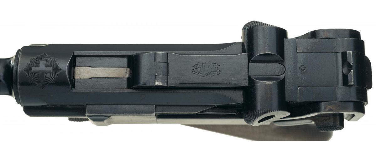 This is an example of a very early DWM Model 1900 Swiss military contract Luger of which an estimated 3,000 military contract pistols were manufactured in the 2,000-5,000 serial number range. These pistols have the dished toggles with toggle lock, flat/recessed breech bolt, no stock lug, grip safety, flat mainsprings, and fast taper barrel that is 4 3/4 inches long. This pistol has the standard "Swiss Cross in Sunburst" over the chamber, and "DWM" scroll on the front toggle. The left side of the barrel extension has the standard Swiss Military Cross and Swiss control proof. Original fixed blade front sight and original "V" notch rear sight with the small Swiss Cross in front of the rear sight. It is fitted with checkered walnut grips stamped with the partial serial number (65) stamped on the back of each grip. This Luger comes with one original unmarked Swiss nickel plated wood bottom magazine.