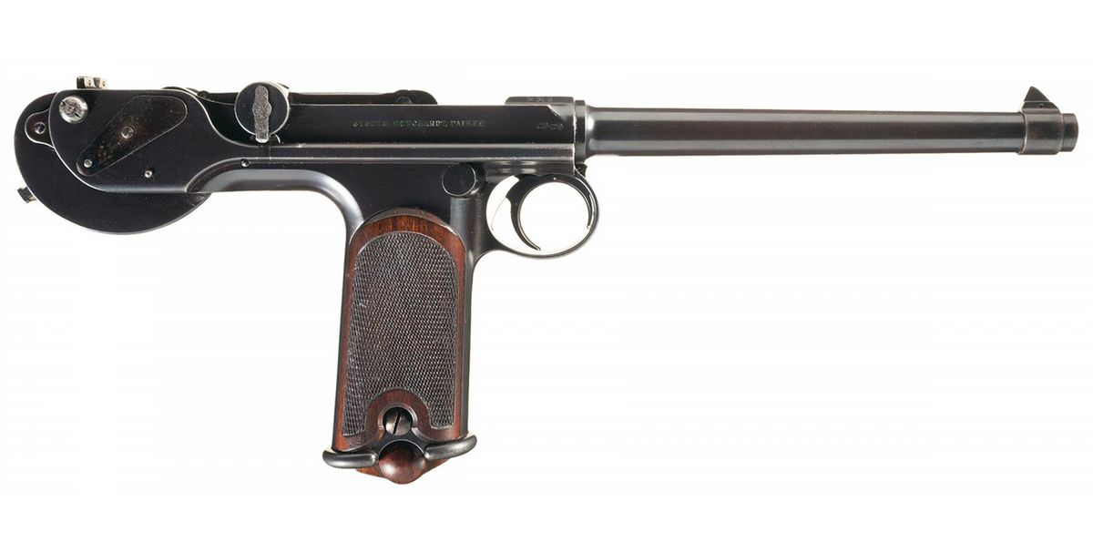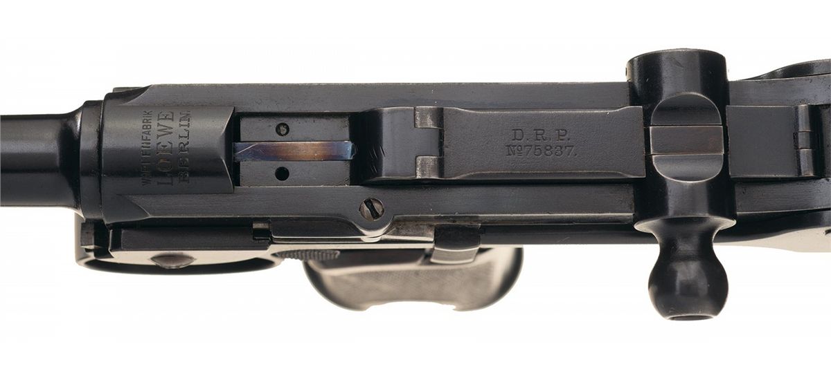 This is a very nice early Model 1893 Borchardt semi-automatic pistol with the original matching magazine. These early model 1893 Borchardt pistols were the true forerunner of the world famous and historic Luger pistol. These pistols employed a unique toggling breech mechanism which was eventually adopted and refined by Georg Luger and later used throughout production of the Luger pistol. The top of the chamber area is marked "WAFFENFABRIK/LOEWE/BERLIN." with the top of the toggle mechanism carrying the German patent markings of "D.R.P./No. 75837". The right side of the barrel extension is marked "SYSTEM BORCHARDT PATENT". The left side of the breechblock, toggle mechanism and barrel extension are all marked with the early German commercial proofs of a "Crown/B" and "U" proofs, with the left rear section of the barrel marked with the fully German commercial proofs that consists of the "Crown/B", "U", and "G/172,28". It is fitted with a set of original grips that has the checkered, center section with the smooth border around the checkering. As noted this scarce early pistol is complete with a matching serialized magazine.