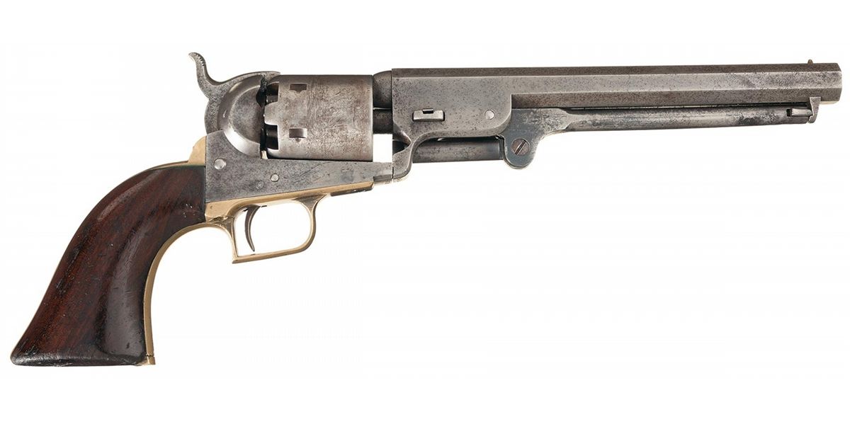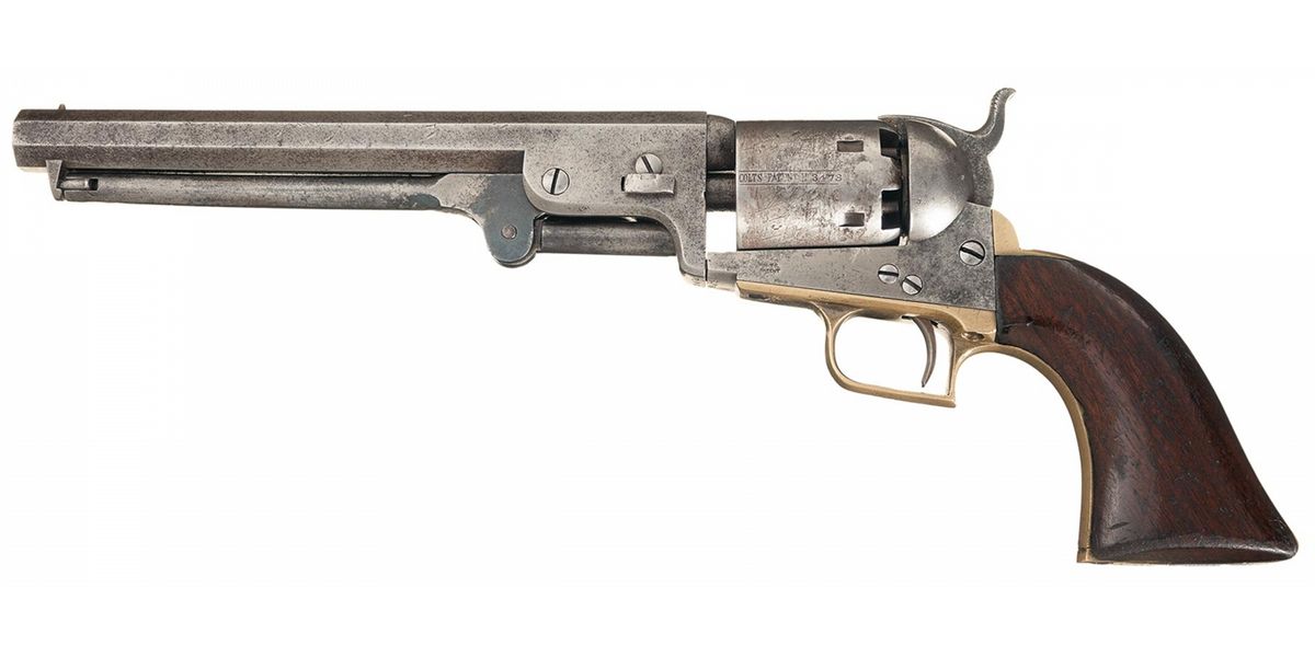 This is an example of a Colt 1851 Navy square back trigger guard revolver that was manufactured in 1851, the second year of production. The first approximately 4,200 Model 1851 Navy revolvers, (First and Second Model), were made with the square back trigger guard. The top of the barrel is marked with the early "-ADDRESS SAML COLT NEW- YORK CITY-" address, the left side of the frame is marked "COLT'S/PATENT" and the cylinder is roll engraved with the Texas/Mexican naval scene as well as a restamped "COLT'S PATENT NO 3478". The complete matching serial number is marked on the loading lever, barrel, frame, trigger guard, wedge, cylinder pin, cylinder and back strap. Brass cone front and hammer slot rear sights. The barrel and cylinder were blue, silver plated trigger guard and back strap, and casehardened remaining parts. Fitted with a one-piece smooth walnut grip.