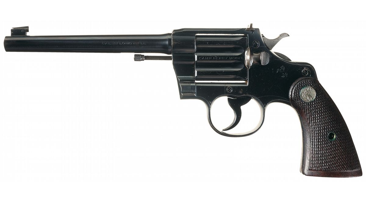 Manufactured between 1920 and 1941. Has an elevation adjustable front sight and a windage adjustable rear sight. Standard markings and features. Fitted with a set of checkered walnut grips with silver Colt medallions.