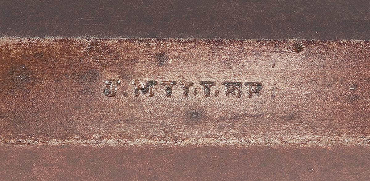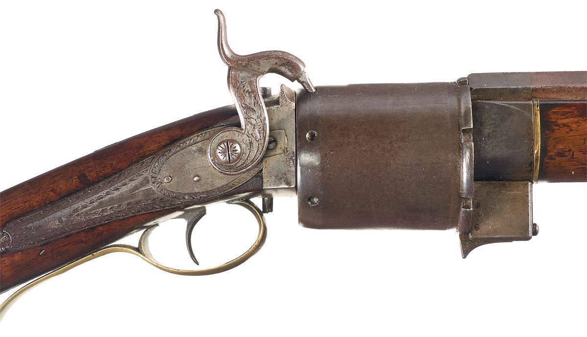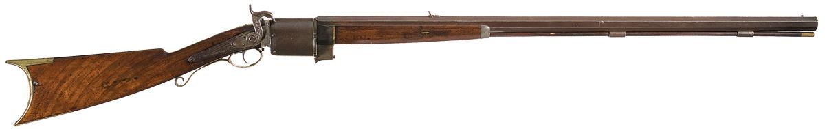 Manufactured circa 1835 to 1850, with only a few hundred produced. Post front sight and a fixed notch rear sight, with "J. MILLER" on the top flat of the barrel. Seven shot manually rotated cylinder with light serrations for easier grip. Light engraving on the lock plate, upper tang and hammer. Smooth straight grip stock, with brass tipped ramrod, brass scroll type trigger guard and crescent buttplate.