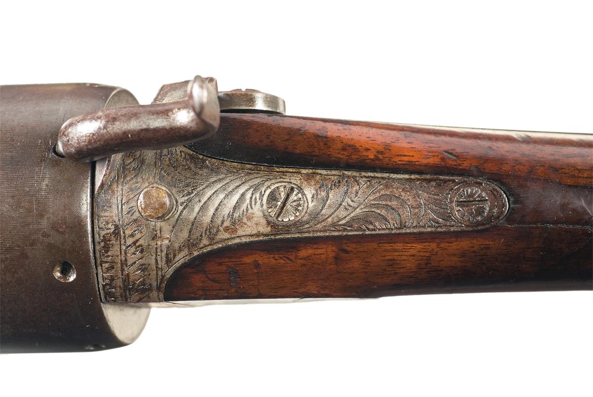 Condition: Very good plus, with a smooth crisp dark patina on the barrel and cylinder. The lock plate, rear portion of the frame, hammer and upper tang retain strong traces of soft original case colors. The brass has a smooth aged patina. The wrist is cracked (left side), otherwise the stock is fine with some minor dings and scratches and a couple minor dents. Mechanically fine.