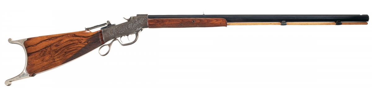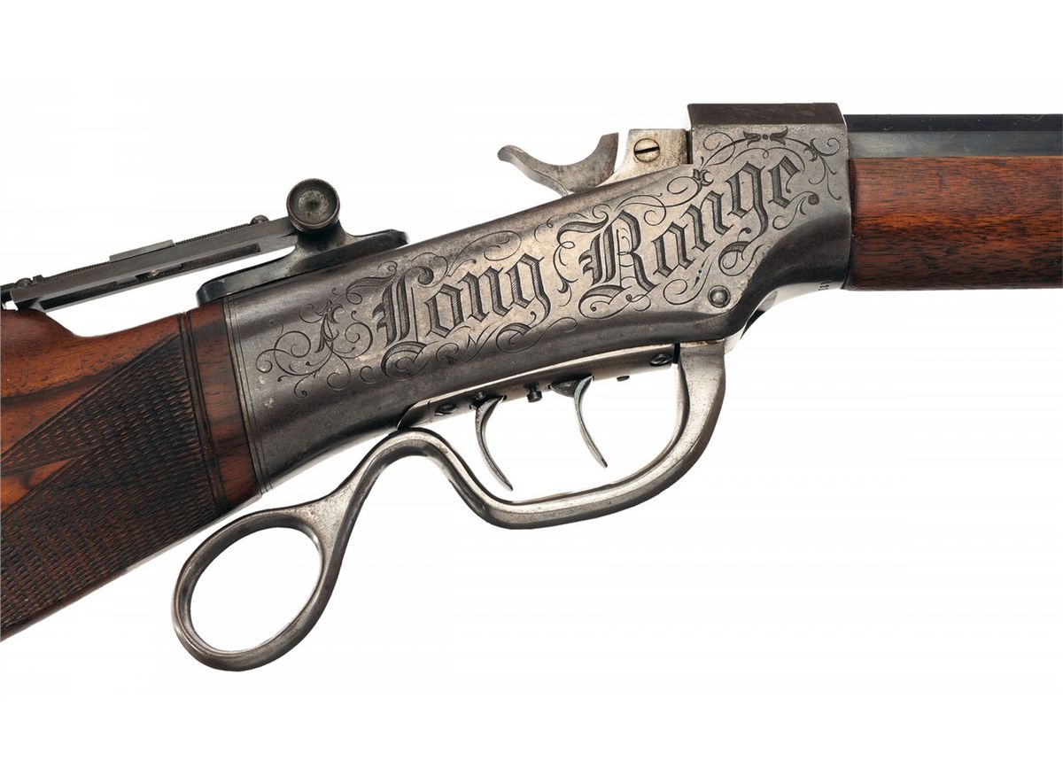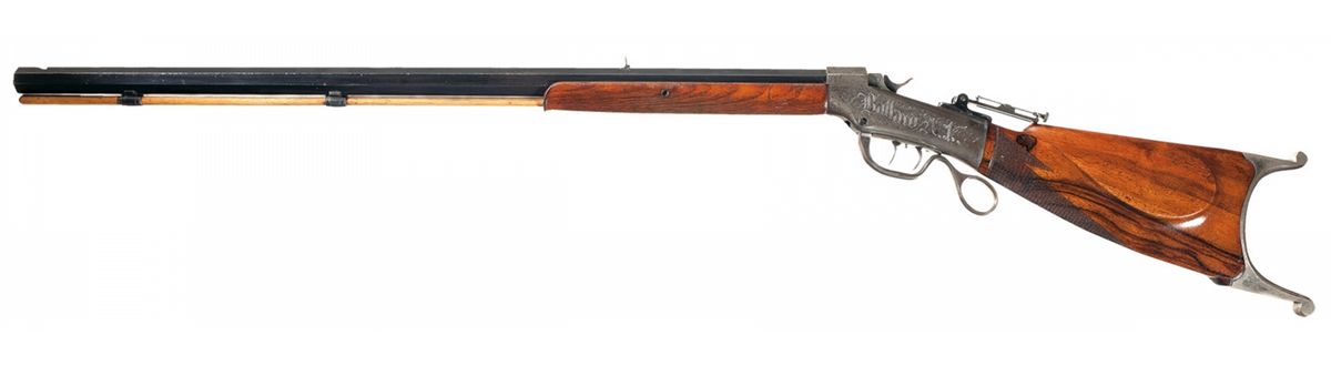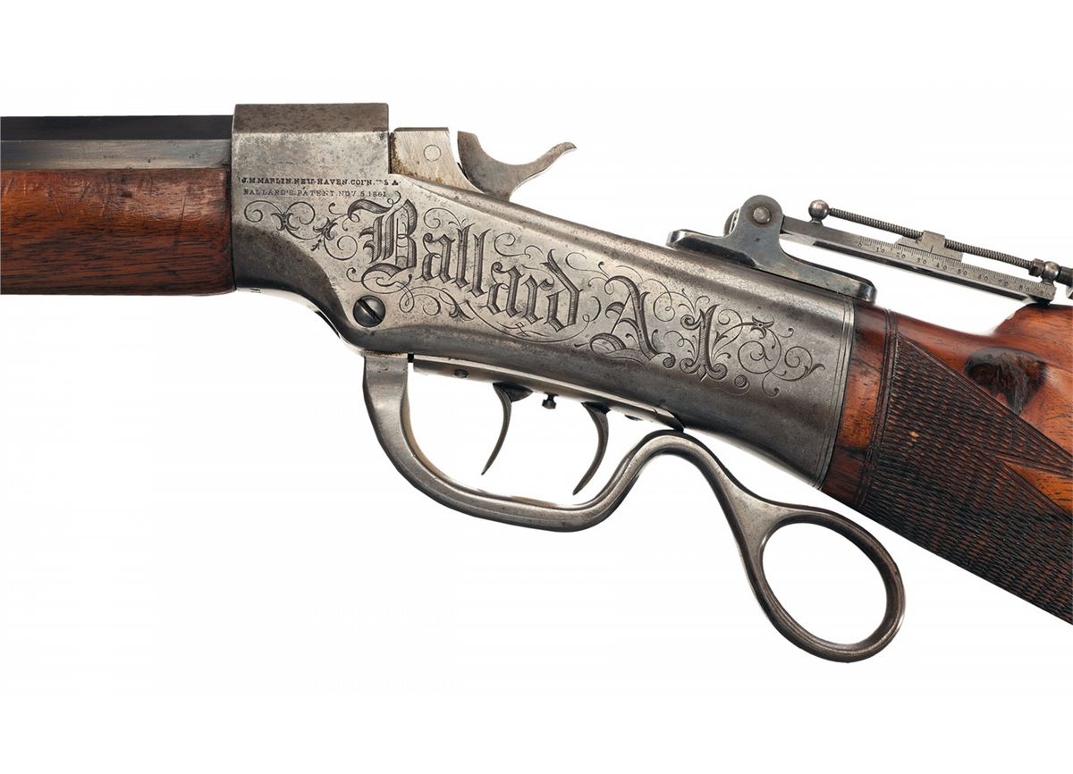 Manufactured from 1879 to 1883. The mismatched serialized barrel, (27354), has a folding two leaf rear sight and an empty front sight dovetail slot with "BROWNING BROS. OGDEN, U.T." stamped ahead of the rear sight and "45 GOVT" stamped at the breech. The Browning Brothers specialized in sporting goods and related items with stores in Ogden and Salt Lake City, Utah. The vernier sight on this rifle is without an eye disk and is graduated from 0 to 90 on the left side. The sides of the receiver have the "BALLARD A1" and "LONG RANGE" engraving with a scroll pattern. The left side of the receiver is stamped with the two line Marlin address/Ballard's patent marking and the underside of the receiver has the serial number. The rifle has double set triggers and a ring shaped lever and mounted with a smooth forearm and checkered buttstock with cheekpiece and nickel plated Swiss buttplate.