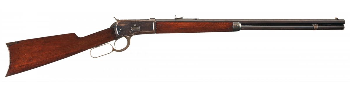 Manufactured in 1892, the first year of production. German silver blade and adjustable buckhorn sights with a full length magazine. The barrel is marked with the two line address ahead of rear sight and "44 W.C.F." at the breech. Upper tang has the three line model/patent information and the serial number is on the bottom of the receiver. Blue finish with casehardened hammer and lever, and mounted with a smooth forearm and straight grip stock with metal forend cap and crescent buttplate.