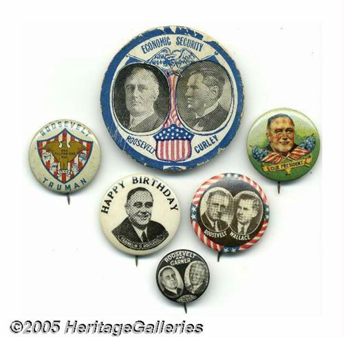 <B>Desirable Franklin Roosevelt Button Group</B></I> There are six different FDR buttons in this group, covering his entire presidency. They include: 7/8" "Roosevelt and Garner" celluloid jugate by Bastian Brothers (mint), most unusual 2 1/4" cardboard disc badge with jugate portraits of Roosevelt and Curley (scattered wear to blue border), 1 1/4" celluloid portrait button inscribed "Happy Birthday Franklin D. Roosevelt" (mint), 1 1/4" celluloid jugate for "Roosevelt Wallace" in clean condition, colorful 1.125" lithograph portrait pin of "Our President" (mint) and another 1 1/8" lithograph pinback for "Roosevelt--Truman" depicting members of the armed services (an original in excellent condition). These are all goodies! Lot:263