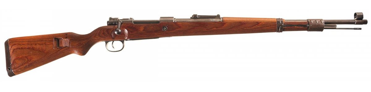 Manufactured in Thuringen in 1945. Hooded blade front and tangent rear sights, with no legible Waffenamt proofs on the barrel or receiver. Matching bolt numbers, with stamped components "bcd" and "45" stamped on the top of the receiver ring, and "qnw" stamped on the floor plate and underside of the receiver. Mounted with a smooth laminate stock, with a faint "Eagle/swastika" proof on the right side of the butt and a cupped buttplate.