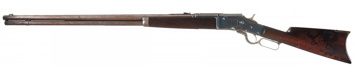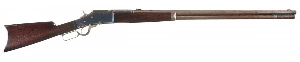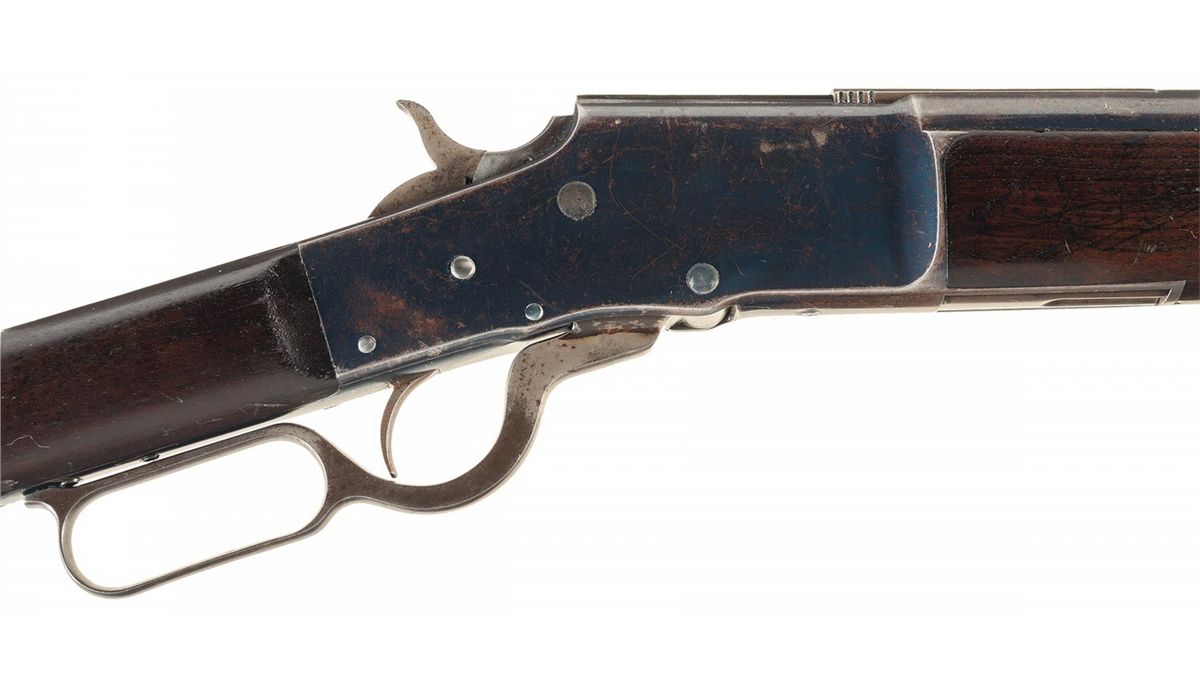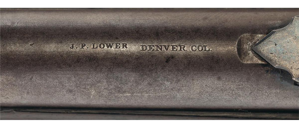 Bullard rifles are desirable on the collector market today as they were manufactured only from 1886 to 1890. The left side of the receiver has a small side plate that allows access to the mechanism inside and the loading gate for the tubular magazine located on the underside of the receiver. This particular rifle has a round barrel stamped "J.P. LOWER DENVER COL" ahead of the elevation adjustable rear sight and is equipped with a German silver blade front sight. The left side of receiver has the usual "BULLARD REPEATING ARMS COMPANY/SPRINGFIELD MASS. U.S.A. PAT. AUG. 16. 1881." marking. The right side does not have the Model 1886 markings. The serial number is marked on the upper tang directly behind the hammer. Casehardened lever and hammer, and the remaining parts are blue. Mounted with a smooth forearm and straight grip stock with an iron forend cap and crescent buttplate.