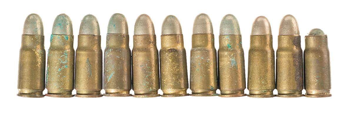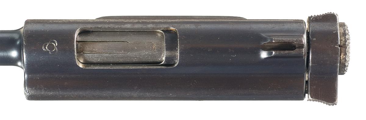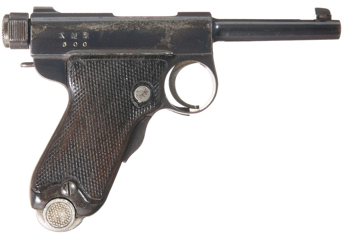 This is a very nice example of a very early, three digit serial number Japanese "Baby Nambu" pistol as manufactured by the Tokyo Koishigawa arsenal. These pistols were intended as private purchase sidearms by high raking officers in the Army and Navy. This pistol has a high quality rust blue finish and straw colored trigger, magazine release, sear pivot pin and bolt lock with a bright finished bolt. The magazine has a nickel-plated body with an aluminum base. The grips are finely checkered hardwood. The top of the chamber area bears the four intertwined cannon balls of the Tokyo arsenal and the right side of the receiver has the Japanese Kanji markings over the serial number "500". The matching serial numbers are also visible on the underside of the bolt, the back side of the cocking knob, the back of the magazine, and on the inside of each grip panel. It is complete with 10 rounds of original WWII Japanese 7mm Nambu ammo. Approximately 5,900 examples of the finely finished, compact, "Baby" Nambu pistol were manufactured before production ceased. The "Baby" Nambu is perhaps the most desirable Japanese semi-automatic pistol.