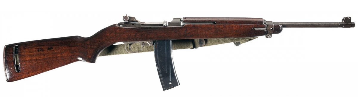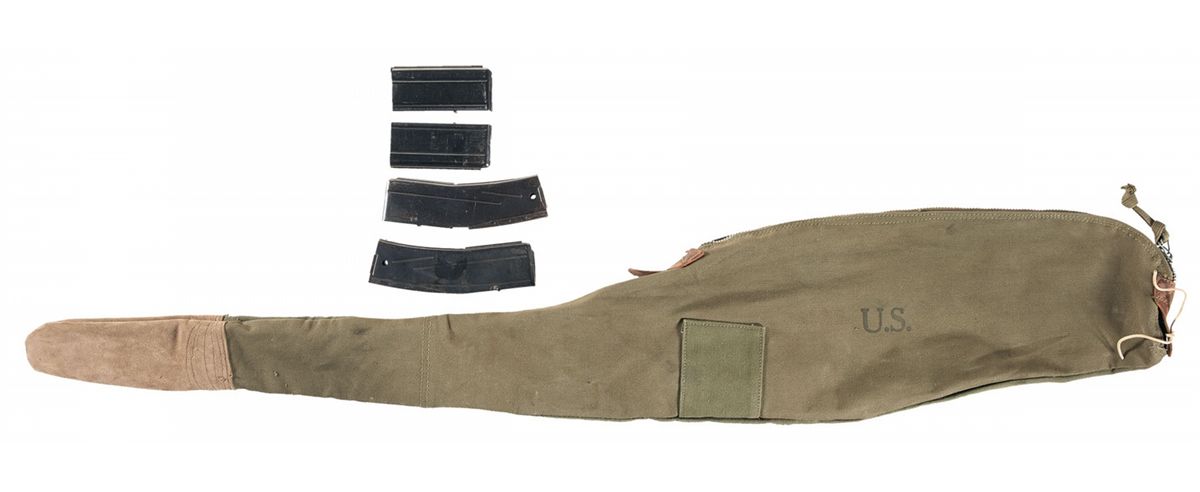 This is a late WWII M1 Carbine as manufactured by Winchester that was subsequently converted to the fully automatic M2 configuration. This carbine was originally produced in late 1944/early 1945 and still retains some of the early WWII parts. It has the standard Winchester M1 Carbine receiver markings with the original Winchester barrel, Winchester marked stock, and type II barrel band. It has a later "SA" marked M2 trigger housing with "INLAND" mark on the side, round bolt and M2 hammer, with the stock being field modified for use with the M2 components. The selector switch is properly marked with a single "A", on the side, with the sear trip lever marked "TM". This carbine is complete with a reproduction green canvas carrying bag and four extra magazines.