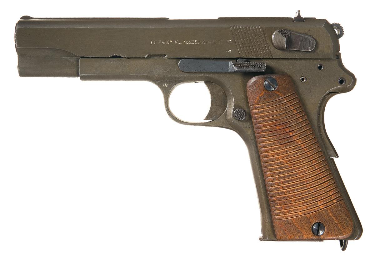 Fixed sights and standard one line marking on the slide, with a pair of small Nazi eagle proofs. Blue finished small parts, with a ring hammer and smooth trigger. Ribbed hardwood grips. With a small box of ammunition, with German label, circa 1943-1944.