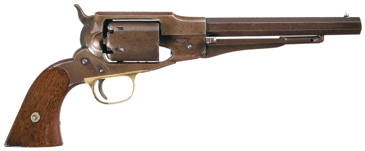 Marked "PATENTED DEC. 17, 1861 / MANUFACTURED BY REMINGTON'S ILION, N.Y." on top of the barrel. The patent was for the grooved lever to allow the cylinder pin to be pulled forward without lowering the loading lever. This was William Elliot's patent and his name is sometimes found on the lever. The serial numbers on these started after the last of the Beal's patent Navy revolvers, at about 15,000, so this is approximately the 565th revolver of this model made. Approximately 12,000 were made in 1862. The serial numbers match in the left side of the frame under the grip, and the bottom of the barrel. A "CGC" cartouche is on the left grip with "W" and "J" initials on various parts. The aforementioned cartouche is also found on the rare U.S. Contract Henry rifles!