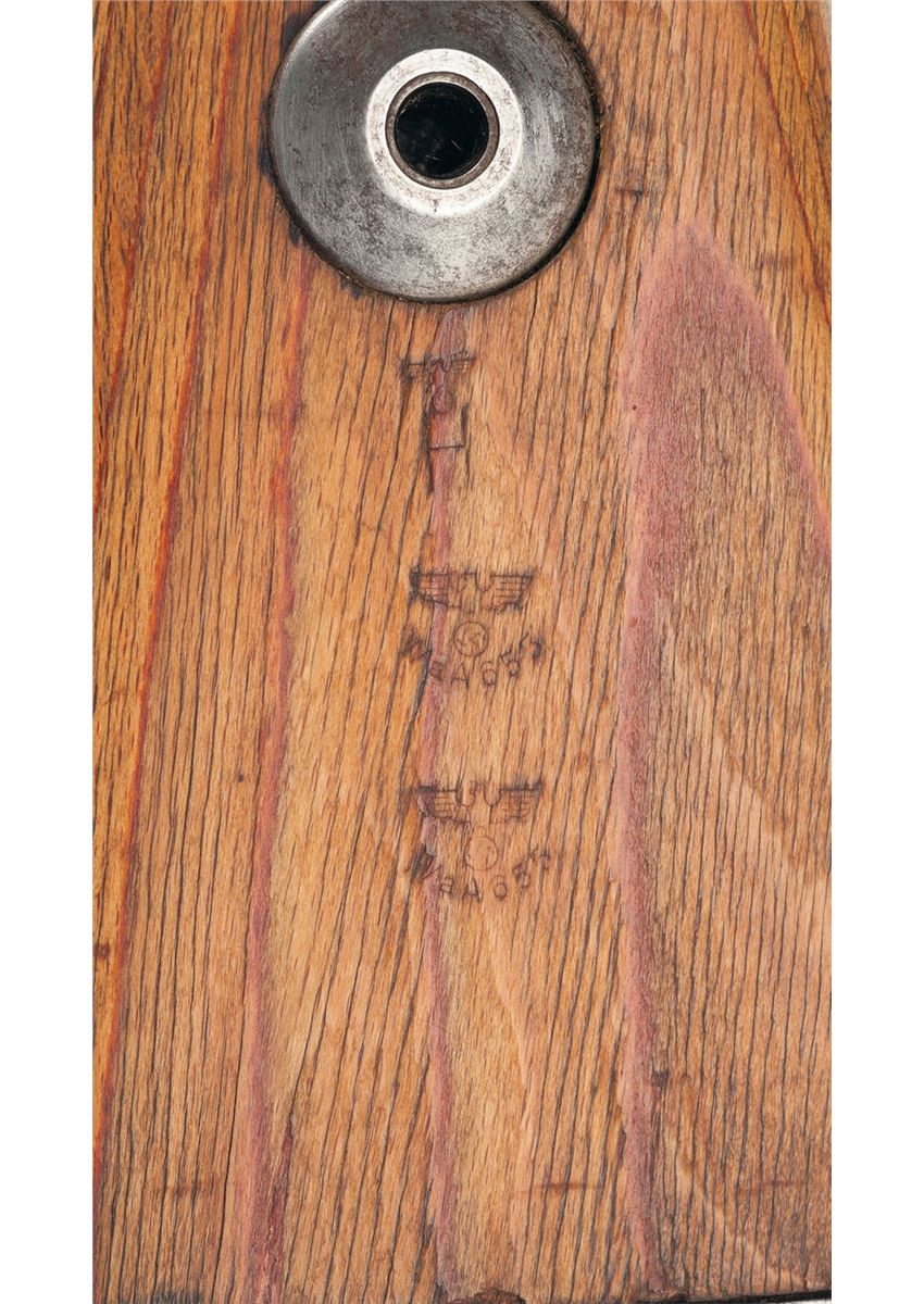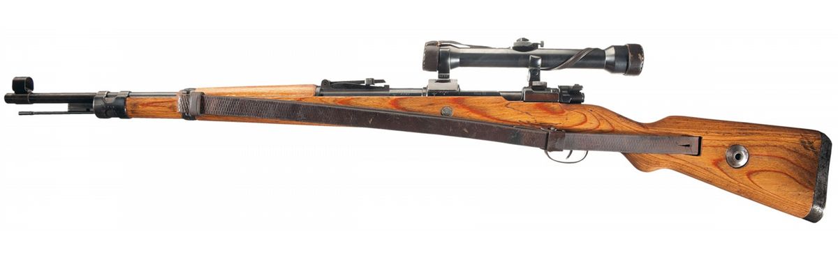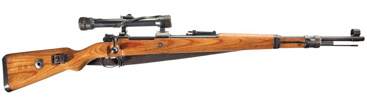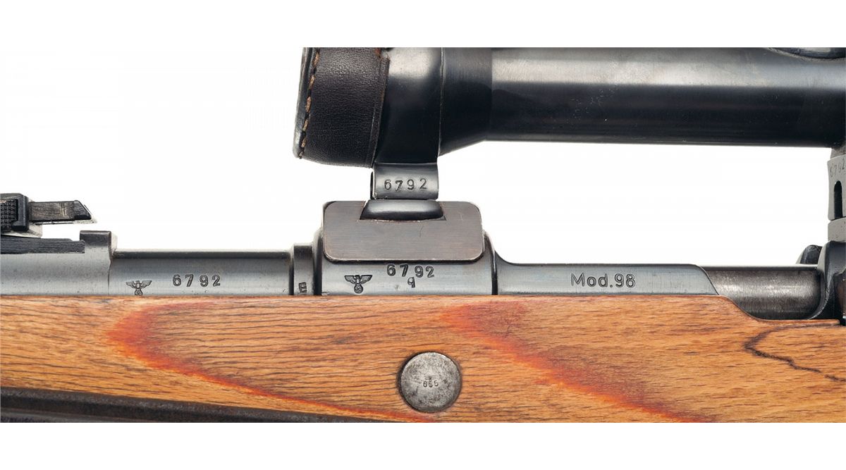 This is an example of an early Mauser K98 rifle equipped with Carl Zeiss scope. The scope is mounted on a unique double claw mounting system. The rings and mounts are integral to the scope and both are numbered to the gun. A large base is soldered to the front receiver ring with a dove tailed piece the claw fits into. The rear base is much smaller and houses the release latch. The scope is marked "Zielvier/Nr 1698/Zeiss logo" and has leather lens caps. The top center mounting adjusting dial is absent of any graduation markings. The left side of the front receiver ring and breech end of the barrel are marked with the Nazi firing proof and the serial number, and the left side of the receiver wall is marked "Mod. 98". There are various parts marked with "Eagle/WaA655" proofs and the matching serial number. All machined parts. Hooded front sight and tangent rear sight graduated to 2,000 meters, slotted cleaning rod and mounted with a laminated pistol grip stock with matching handguard, cupped buttplate and a dark brown leather sling. The right side of the buttstock is marked with an eagle proof over "H" (army issue) and two "Eagle/WaA655" proofs, with the matching serial number on the bottom and two smaller proofs in the grip area. Complete with a brown leather scope case with shoulder strap.