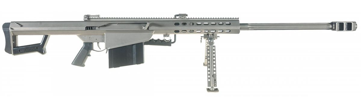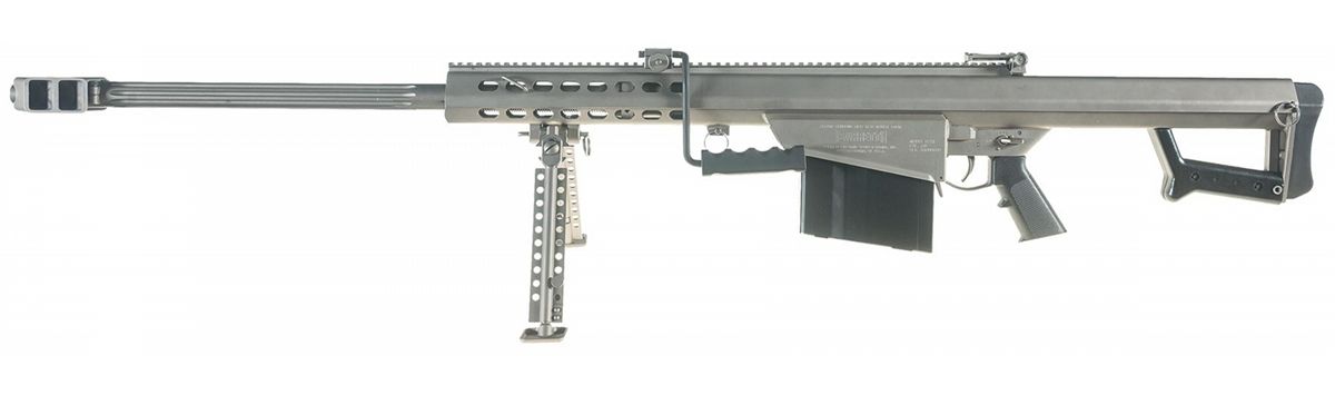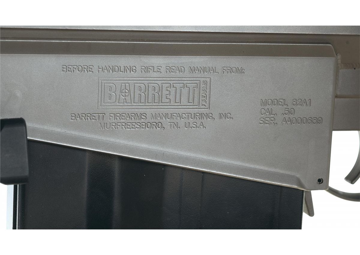 Developed in the early 1980's the M82 series of weapons have been adopted by a number of military forces, where it's long range striking power makes it useful for disabling vehicles and equipment, detonating enemy ordnance and battlefield sniping at ranges well beyond conventional rifle range. This example has been finished by the Barrett Factory via the NP3 method, an electroless nickel coating with PTFE (polytetrafluoroethylene, known by the brand name Teflon) co-deposit. Unlike impregnated Teflon, which is applied after the nickel and only serves as an overcoat, co-deposited Teflon is applied simultaneously and is mixed through the entire depth of the nickel, providing for greater wear resistance and lifetime self-lubrication, combined with an attractive satin gray, non-reflective finish. A spring loaded folding blade front sight and a folding peep rear sight are integrated into the 23 3/4 inch top-mounted Picatinny rail, with a swiveling carry handle mounted. The signature 2-chamber chevron muzzle brake is mounted on the fluted barrel, with a ventilated receiver, folding metal bipod, AR-15 style grip and safety, and a rubber padded buttstock with "club foot" style hand rest. With a Pelican 1750 hard case. Again this rifle comes to RIAC directly from the Barrett Factory Archive Collection.