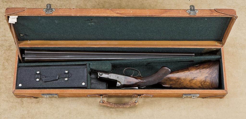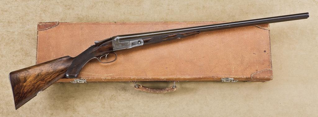 Desirable Parker CH-grade 20ga side by side shotgun. 26-1/4” barrels, double triggers, standard extractors, fancy checkered stocks with metal skeleton buttplate and checkered butt. Serial number “91584”. The titanic steel marked barrels show 50-70% blue turning plum brown patina. The left barrel is unmarked, the right barrel shows the initial “K” a large numeral “3” a small numeral “8”, “Patnd April 11, 1875”, with large number “4” towards breech. Each barrel shows a “+” sign near the lug, and the lug shows large “O” marking. The frame shows high quality engraving with pointing dogs on each side surrounded by Parker scroll, running stag on bottom of frame. The frame shows patina finish with faint traces of case hardening mixed in and beneath the lever. The trigger guard has drifted to a light brown patina. The wood is just good with a break and glued repair to right side of wrist which needs to be properly restored. Other than this damage the wood would have been good to very good plus, with checkering still fairly sharp. The action is tight, the bores are very good. There is some bright case hardening remaining on the action. The gun is contained within and old generic dealer’s-type luggage case. A desirable combination of gauge and grade. Est.: $3,500 - $7,000.