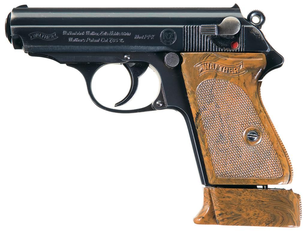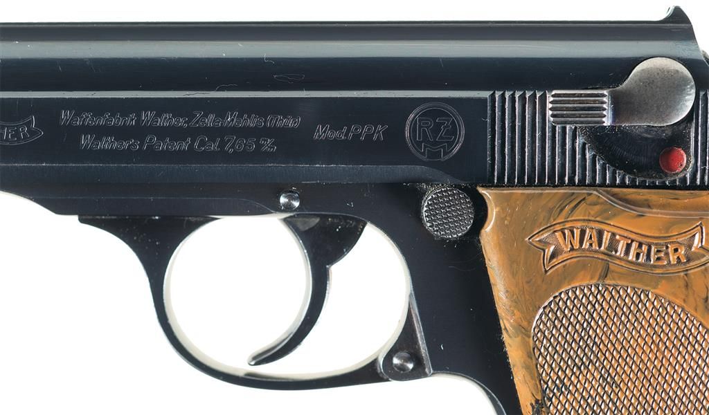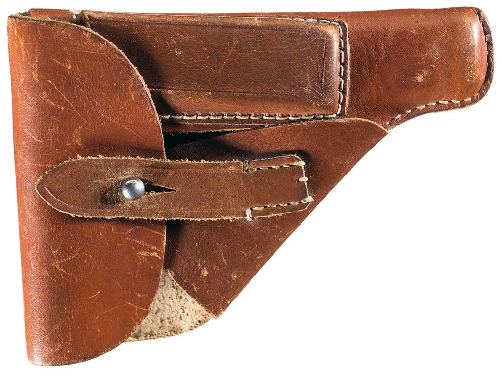 This is a very fine Walther PPK pistol with the high desirable/scarce "RZM" markings on the slide. The Reichs Zeugmeisterei (RZM) served as the quartermasters office of the National Socialists party (NSDAP) and later became the chief approving authority on some types of military weapons, clothing, textiles and some raw materials for the Third Reich. The "RZM" markings on Walther pistols, were used on a periodic basis and are found in several serial numbers ranges with the earliest block of numbers being approximately 803,638-844,468, with this example being right tin the middle of that block. It has the standard Walther factory slide markings on the left side followed by the circled "RZM" markings. The right side of the pistol has the early "Crown/N" commercial proofs on the barrel, chamber area and slide. The inside of the slide is correctly numbered (477) to match the frame. It has the 90 degree safety and checkered streaked brown plastic with the "WALTHER" inside a banner on each side of the grip. This pistol is currently fitted with a standard blued Walther marked magazine with the very scarce, large brown plastic finger rest base plate. This excellent pistol is accompanied by an original WWII, unmarked German Walther PPK leather holster, and the small original Walther tin case for the cleaning accessories. This case holds two spare black plastic magazine bases, a cleaning brush, a small glass vial with cork stopper, (still filled with oil) and a small plastic container of lubriplate, white grease. The current consignor of this pistol stated that he purchased this pistol from the widow of a Capt. D. Smith who was a WWII officer with Gen. Patton's armour unit. A Nazi Colonel reportedly surrendered to Capt. Smith during the war, and upon doing so he opened his valise, and removed the pistol, its holster and this small metal box with contents and presented them to Capt. Smith. No surrender documents accompany this pistol, however.