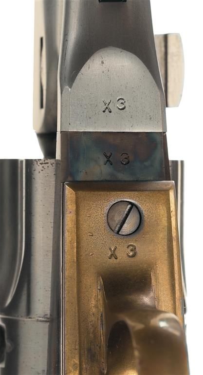 The barrel, cylinder, wedge, screws and trigger on this example were left in the white with the loading lever, frame and hammer casehardened. The serial number "X3" is stamped on the barrel lug, frame and trigger guard. The backstrap, left side of the frame and the cylinder are unmarked. Fitted with a smooth one piece walnut grip. With a Black Powder Series box numbered to another gun.