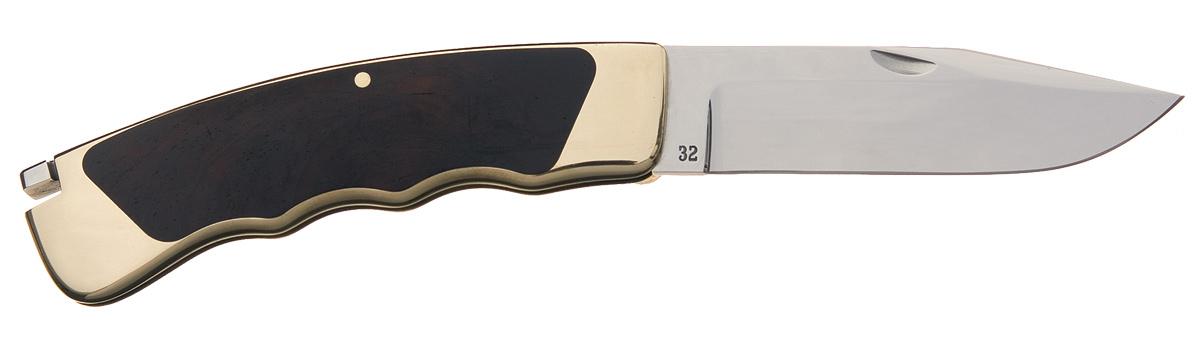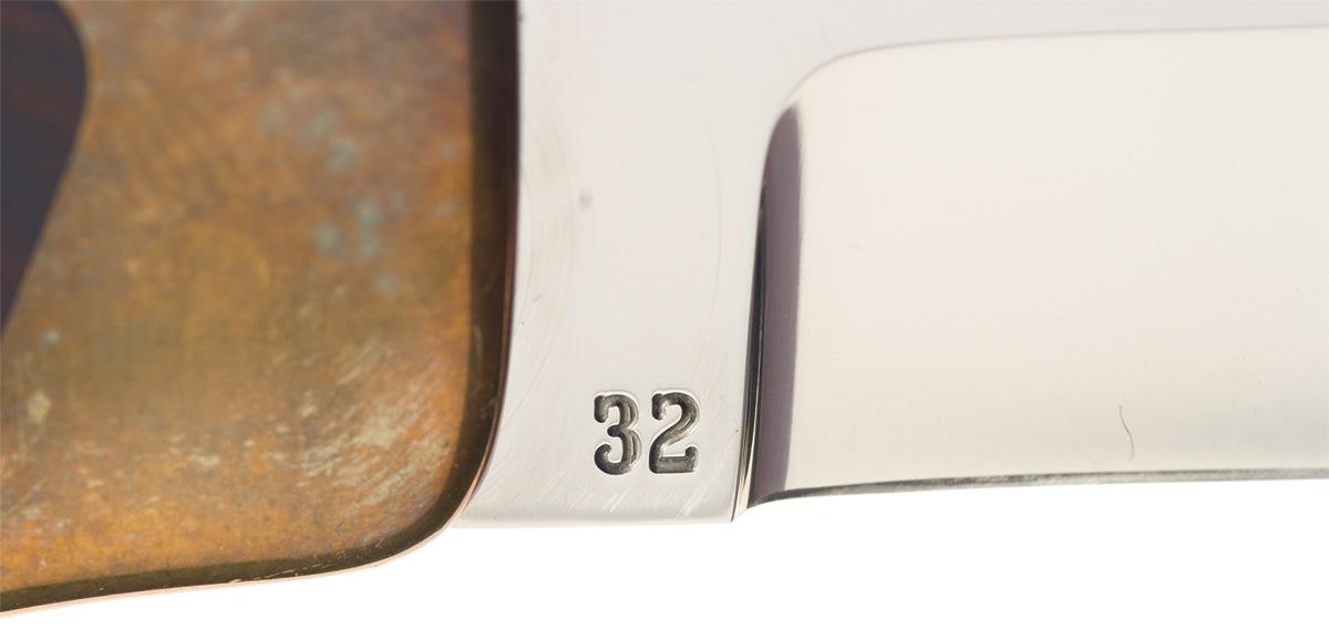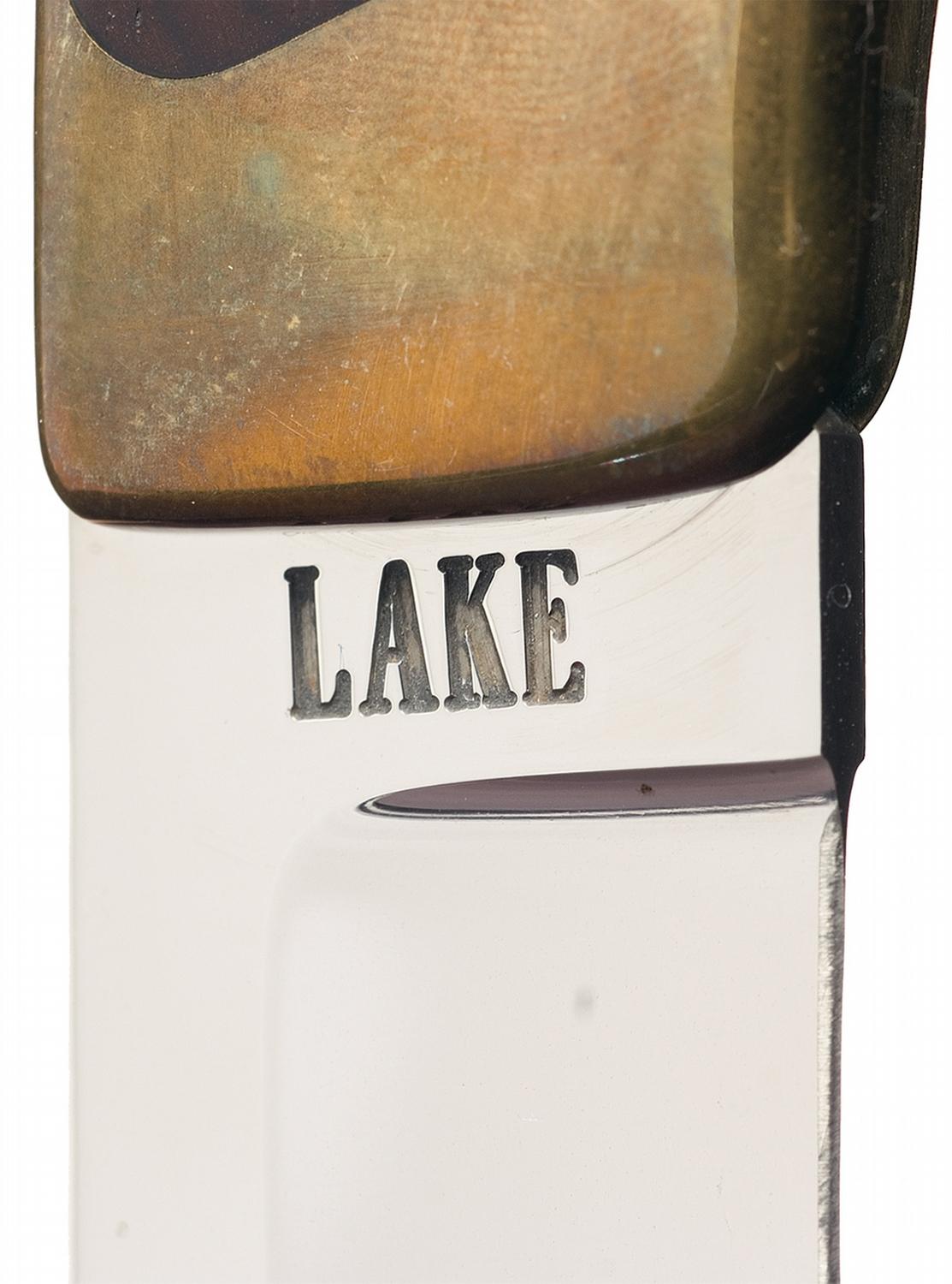 This is a Number 32 folding knife handcrafted by Ron Lake. Selling his first knife in 1966, Ron Lake has become one of the most sought after knifemakers in the world today, with several of his knives included in the collections of the Smithsonian Institution, the National Metal Museum, the National Knife Museum and the Randall Knife Museum. Lake is the inventor of the modern interframe and his folders have his patented tail lock release tab. He co-authored the book How To Make Folding Knives in 1988. This Lake folding knife has a 4 inch blade marked "LAKE" and "32". Brass finger groove frame featuring nicely figured walnut inlays with a single brass rivet. This knife has Lake's signature tail lock release tab. OAL: 9".