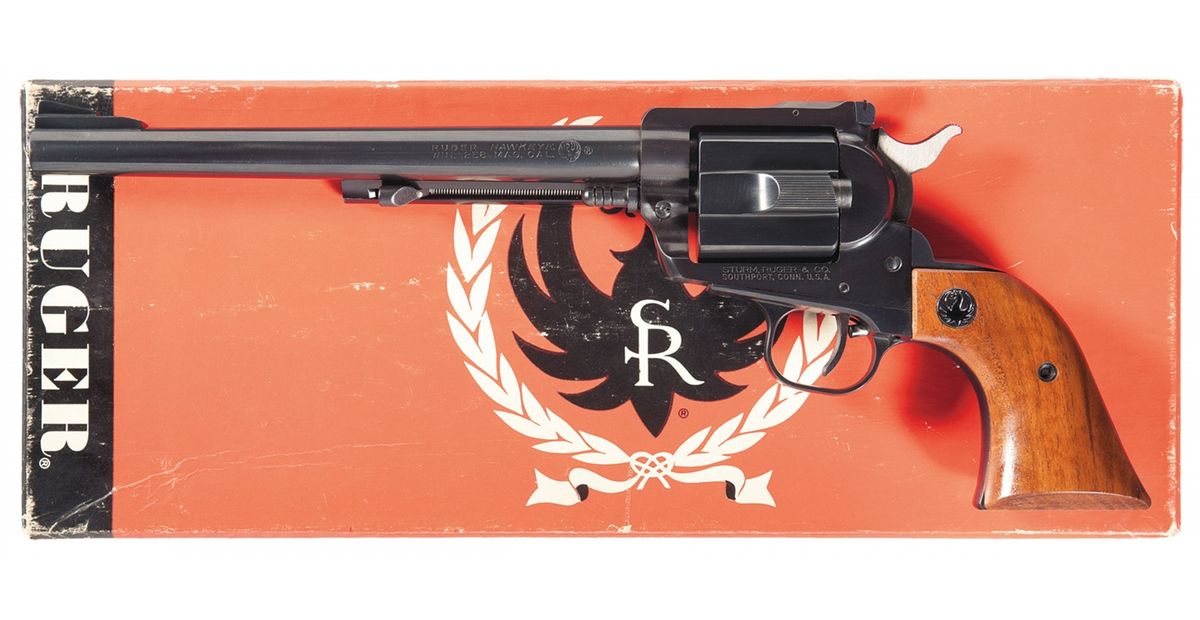 This pistol was manufactured in a limited quantity of 3,300 between 1963 and 1964 and it features a fixed blade front sight with an adjustable rear sight. Rear of the barrel is factory drilled and tapped for a scope base. The flattop frame has been equipped with a rotating breechblock with the latch on the left. Fitted with smooth grips with Ruger medallions. Complete with correct original box.
