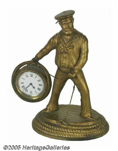 <B>Desirable Sailor "Occupational" Clock</B></I> Possibly of German manufacture. Wonderful detail with what appears to be original gold painted finish. The clock portion is set into a coil of rope he is holding. Excellent condition except clock not working. Height 8". Lot:253