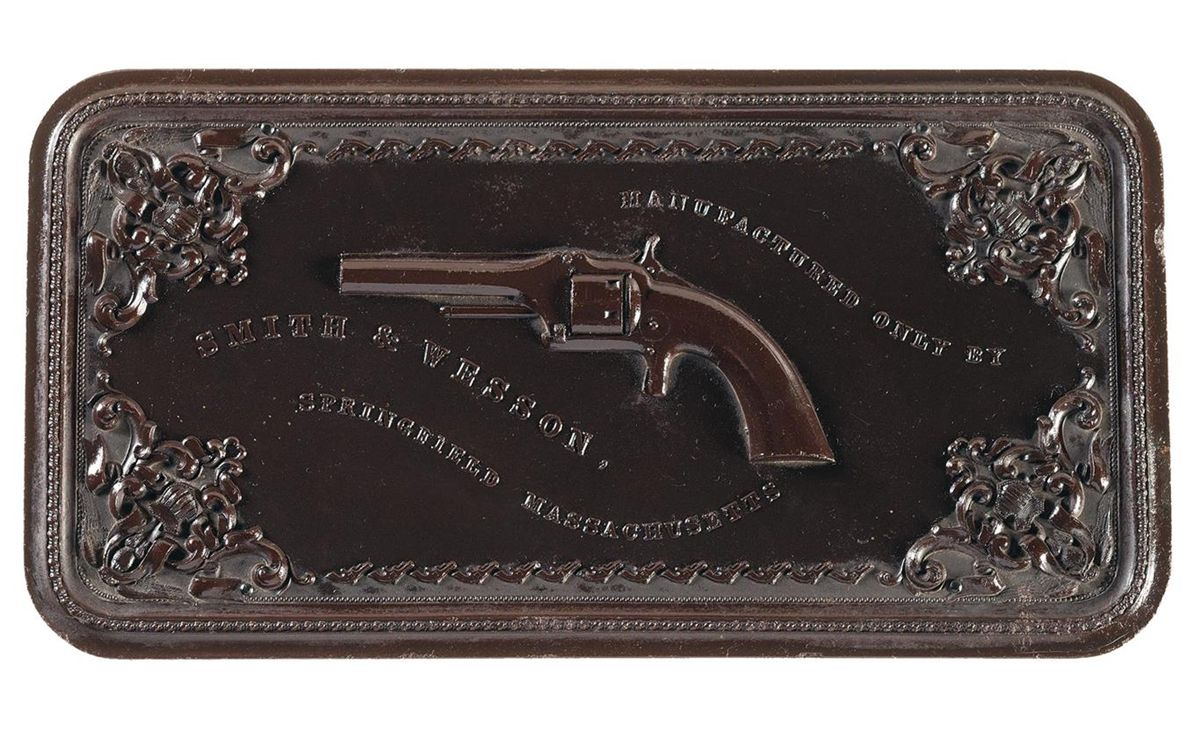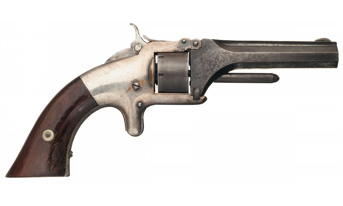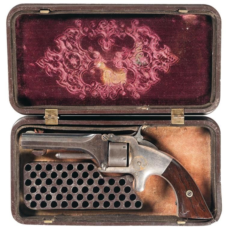 Manufactured from 1857 to 1860. The top of the rib is marked "SMITH & WESSON SPRINGFIELD, MASS." The matching serial number is marked on the butt and on the inside of both grip panels. The matching assembly number "O4" is marked on the left heel under the grip, the back of the barrel lug and the front face of the cylinder. Blade front sight, blue barrel and cylinder, and silver plated brass frame. Fitted with varnished rosewood grips. Complete in an original Smith & Wesson Gutta Percha case with decorative caved lid showing the image of a Number 1 revolver and "MANUFACTURED ONLY BY/SMITH & WESSON,/SPRINGFIELD MASSACHUSETTS". The lining in the lid is a floral design purple velvet and there is purple velvet in the bottom and a 56 round cartridge block.