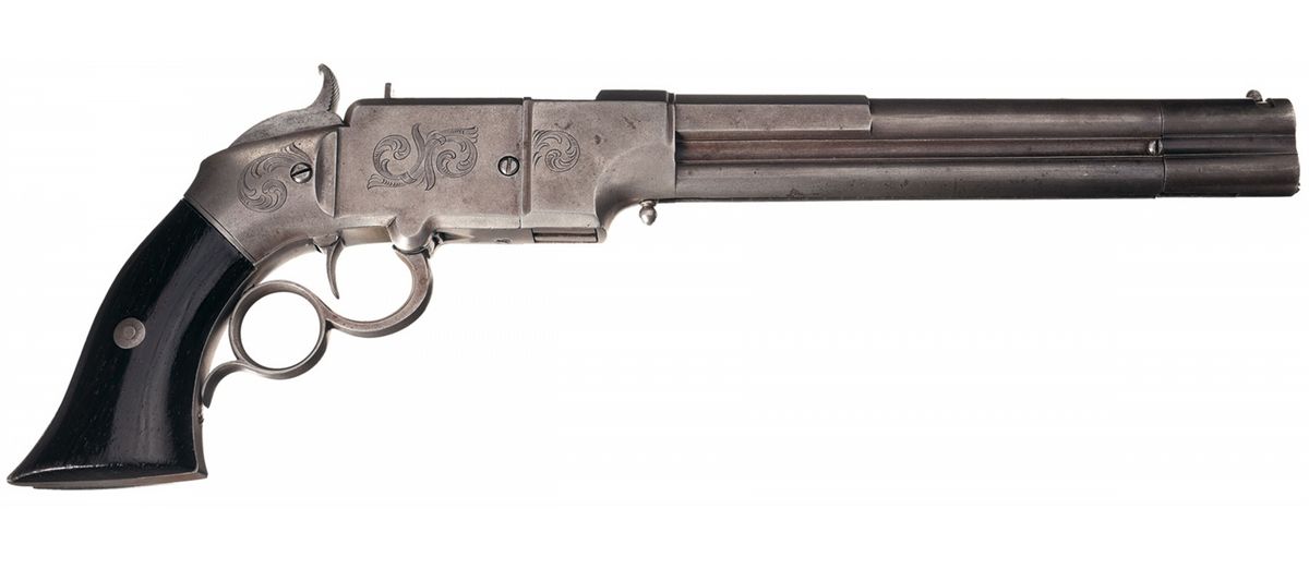 Smith & Wesson Large Frame, Type I, Repeating Pistol with Smith & Wesson factory letter. The letter states that this pistol, serial number "147" was manufactured in 1854 and was sold through the S&W agent J. Dixon Company of New York. The pistol has a half-round/half-octagon barrel with integral ten-shot magazine. The pistol has the distinctive "Type I" frame with hump behind the hammer, single spring screw on the bottom of the frame and flat uncrowned muzzle. The finger lever has a spur at the bottom. The pistol has a screw-fastened L-shaped fixed rear sight on the frame and a flattened cone front sight. The hammer has a knurled spur. The pistol has two-piece rosewood grips with a varnish finish. The top and sides of the frame and back of the hammer are decorated with open scroll and leaf engraving. The top barrel flat is roll-stamped with the legend "SMITH & WESSON/NORWICH CT./CAST-STEEL" in three lines followed by "PATENT". The serial number "147" is stamped on the back face of the rear sight and on the left side of the butt underneath the grip. "147" is written in pencil on the inside of both grips. All of the visible serial numbers match. Designed in 1852, the Smith & Wesson Repeating pistol was the first successful American-made handgun capable of firing a self-contained cartridge. Smith & Wesson produced fewer than 500 large frame .41 caliber repeating pistols. Surviving examples are extremely rare.