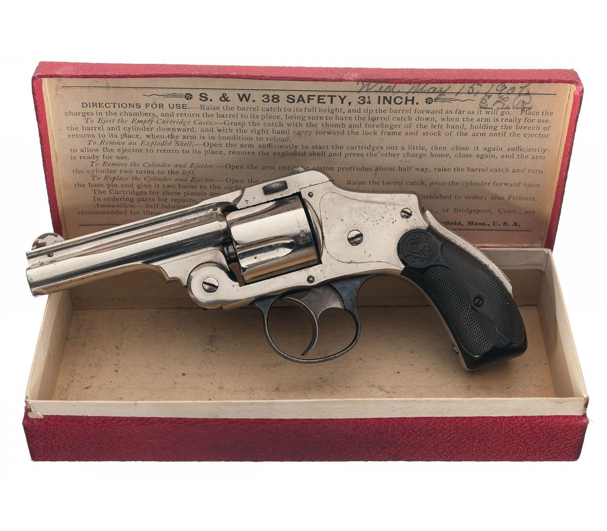 Manufactured circa 1887. The barrel rib has the standard address/patent marking and the distinctive "Z-bar" first model barrel release. Matching serial number on butt, cylinder and barrel. Fitted with checkered S&W monogram imprinted grips. The factory box is numbered to another gun but has the correct end label for this type of revolver.