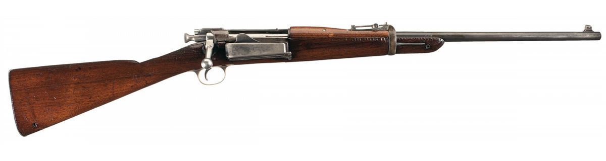 These carbines were used throughout the Spanish American War and during the early 1900s until the development of the 1903 Springfield rifle. The left side of the receiver is marked "U.S./1896. SPRINGFIELD ARMORY." next to serial number. The carbine is mounted with an unmarked replacement stock and the original early handguard. It retains the barrel band that protects the rear sight and the trap door on the flat steel buttplate. Fitted with a tangent and ladder rear sight that is graduated to 18 on the blade and 6 on the left side and standard blade front sight.