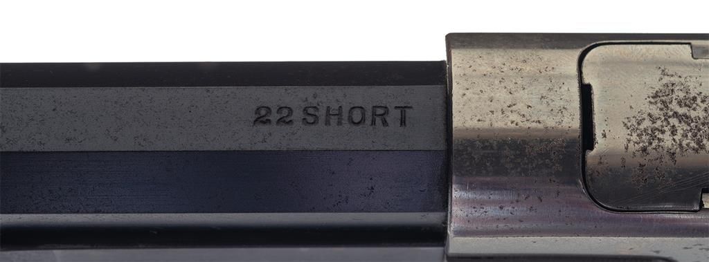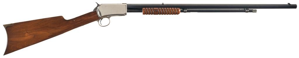 Manufactured in early 1905. Has a blade front sight and a fixed rear sight. The barrel has the third style markings with the caliber stamped at the breech end. The barrel, magazine tube and trigger are blue, the hammer is casehardened and the receiver, guard and buttplate are nickel plated. Mounted on a 12 groove round walnut forearm and straight grip stock with curved steel buttplate.