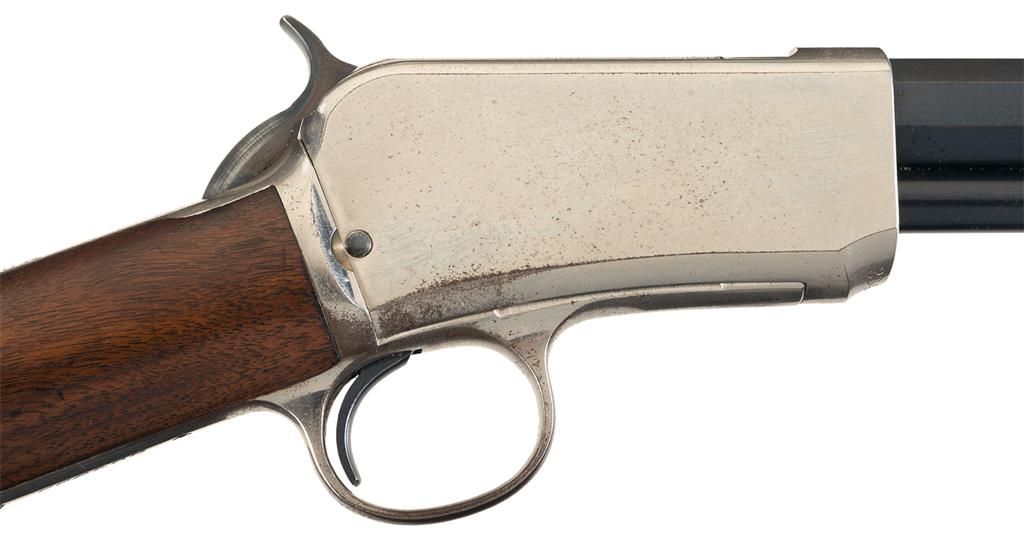 Very fine, the blue components retain 90% plus of the original finish with scattered flakes of surface rust, some cycling and minor high edge wear along with scattered minor scratches. The nickel plated components retain 85% plus of the original finish with flaking, bubbling and wear. The wood is excellent with some scattered scratches and dings. Mechanically excellent. An attractive and rare Winchester Model 1890 Slide Action Rifle!