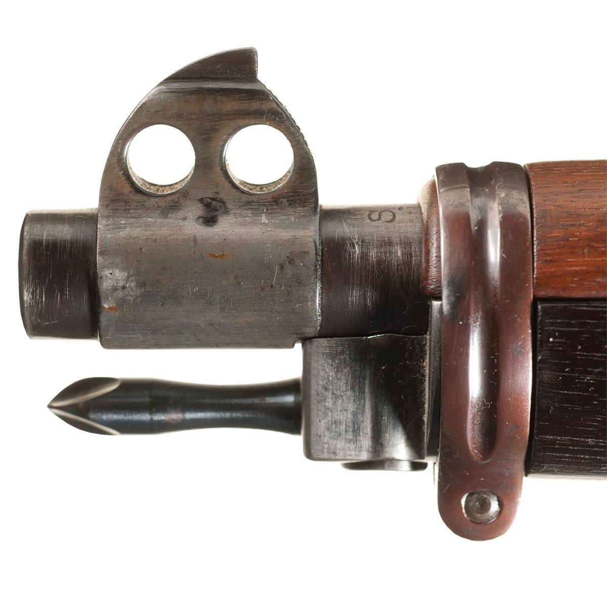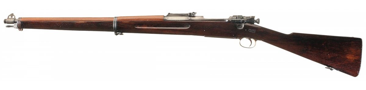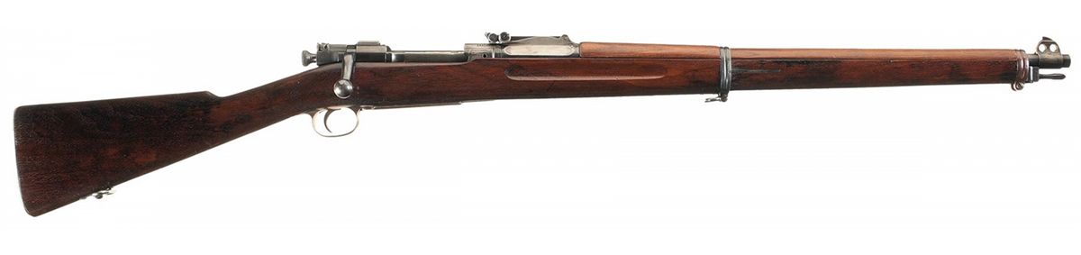 This is an example of a U.S. Model 1903 'Rod Bayonet' rifle similar to those manufactured by Springfield Armory circa 1904. This rifle is similar to one the of nearly 73,000, Model 1903 rifles manufactured with the unique rod bayonet before production was halted in January 1906 after the Ordnance Department decided the rod bayonet was inadequate, adopting instead the knife bayonet. Nearly all of the original rod bayonet Model1903 rifles were altered to accept the Model1905 Bayonet and subsequently modified to chamber the .30-06 cartridge. This rifle has been restored to the original rod bayonet configuration using an original stock, Krag style rear sight, rear sight base, rod bayonet, upper barrel band, rod bayonet catch and front sight. The left side of the stock is stamped with an Ordnance final inspection mark that consists of the script initials "JSA" above the date "1904" surrounded by a rectangle with rounded corners. A circled script "P" proof mark is stamped on the underside of the stock behind the trigger guard. The buttplate is not checkered and has the early small diameter trapdoor stamped with the assembly number "605" on the inside. The receiver has the early small letter markings with Roman (serif) letters. The rear sight base and front sight have been reinstalled on a .30-06 caliber barrel marked "SA/05/A" behind the rear sight base. The base pin on the rear sight base and stud pin on the front sight are not milled flush as they were on original rifles. The rifle lacks the original style follower, solid lower barrel band and stacking swivel. The trigger guard has the cross pin modification added to converted rod bayonet rifles. The bolt body is blue instead of bright and the ejector has a dark finish rather than the niter blue found on original rifles. The bolt sleeve and safety are later post 1904 replacements. The hand guard is a reproduction that lacks the riveted spring clip. The Rod Bayonet Model 1903 is one of the rarest U.S. martial arms. Fewer than 100 original Model 1903 Rod Bayonet rifles are believed to exist in museums and private collections. Original components of the Rod Bayonet Model 1903 such as stocks and barrels are nearly impossible to obtain. It would be extremely difficult to assemble this rifle today. Restored rifles like this example offer collectors the opportunity to add a representative example of a nearly unobtainable but extremely important rifle to their collection. The rifle is complete with a reprinted M1903 manual.