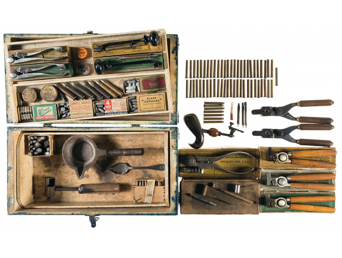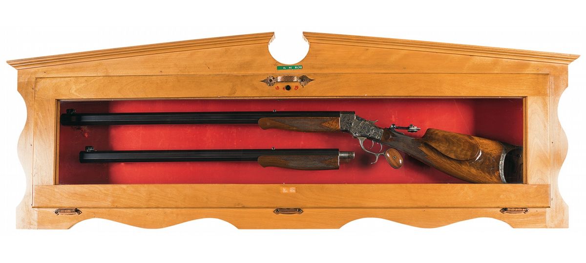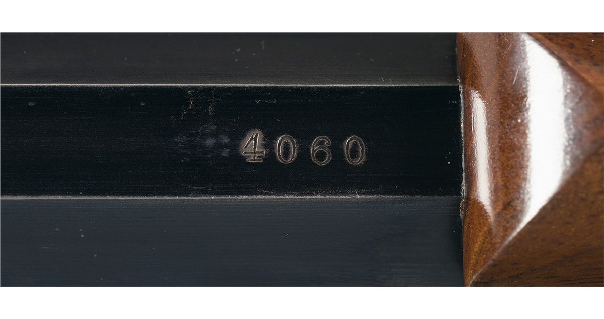 Extremely fine. The barrels retain 95% period refurbished blue finish with areas beginning to thin to a smooth gray and plum, and high edge wear. The receiver retains 97% original case colors. The buttplate retains 85% original case colors with some areas of smooth dove gray and some brown speckling. The lever retains most original faded case colors with a smooth silver gray patina on the balance. The forearms and stock are also excellent with a couple of moderate scratches on the stock below the cheekpiece, overall some minor dings and handling marks with crisp checkering. The engraving and markings are crisp and clear. The action is excellent. The accessories are all good. The case is broken in the back causing the lid to be loose when open. The display case is very good with a couple crude repairs and alterations on the back.