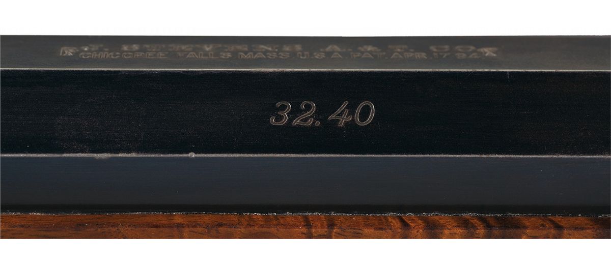 This is an extremely fine example of a Stevens Ideal Model 51 Single Shot Schuetzen rifle. This model rifle was basically an upgraded, deluxe version of the standard Stevens Walnut Hill Target rifle that was produced from 1896-1916. This model was specifically equipped with the following standard features: scroll engraved receiver, double set triggers, straight grip stock, deluxe checkered walnut stock and forend, heavy weight #4 barrel, nickel-plated double prong Schuetzen buttplate, short loop lever with two-piece wood panel insert, a globe front sight and Vernier tang mounted rear sight. This rifle has a level in the rear sight dovetail slot. These were built in a variety of calibers in both center fire and rimfire. The top flat of the heavy 30 inch barrel is marked in two lines "J. Steven A&T CO./CHICOPEE FALLS MASS. U.S.A. PAT. APR 17 94" flanked by Maltese crosses and the left side of the barrel is marked "32.40". The extra barrel is 28 inches in length and marked with the same top flat address, patent date and the left rear flat "25.21". Both barrels are marked with the matching serial number on the bottom flat, one under the forearm, the other ahead of the forearm and with the number "2". Additionally the 25-21 barrel has the number "1" on the bottom flat. Each has its own nicely figured checkered walnut forearm, with "1/060" stamped on the rear of the 25-21 forearm and "4060" on the other. The face of the receiver is marked "0" and "51". The extra barrel has a globe front sight and a level in the rear sight slot. The sides of the receiver have deluxe factory engraving that consists of the scroll engraved patterns with a deer on the left side and a prong horn antelope on the right. As noted this rifle has the deluxe special select walnut stock with multi-point checkered wrist, cheekpiece and double prong Schuetzen buttplate. The rifle comes with a wooden case containing various items including an Ideal bullet mold for each caliber, Ideal re & decapper for each caliber, an Ideal 32-165 bullet mold, Ideal No. 3 special 32-40 resizer, Ideal ball seater for each caliber, iron pot for melting lead and a UMC No. 1 tin of primers, mostly full and a UMC No. 2 primer tin, partially full. Also with the rifle is a contemporary maple display case with glass front. The case is designed for wall mounting.