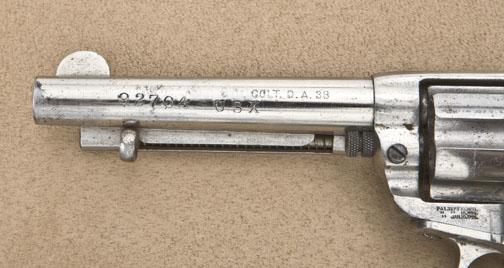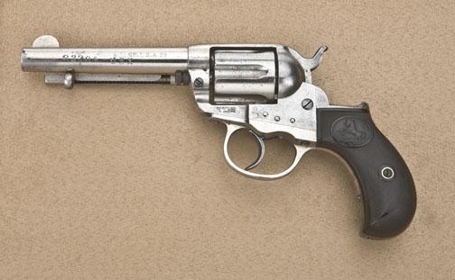 Desirable U.S. Express Co. marked Colt Model 1877 DA “Lightning” revolver, .38 cal., 4-1/2” barrel, nickel finish, checkered hard rubber grips, #92704. This gun is in overall very good condition showing approx. 50%-60%original finish, some old light cleaning to the frame, good action at time of description, fair bore, good grips; left side of barrel is stamped “92704 U S X”. An antique Express Co. marked Lightning thatshould be further researched with the Colt Historian. Est.: $1,000-$2,000.