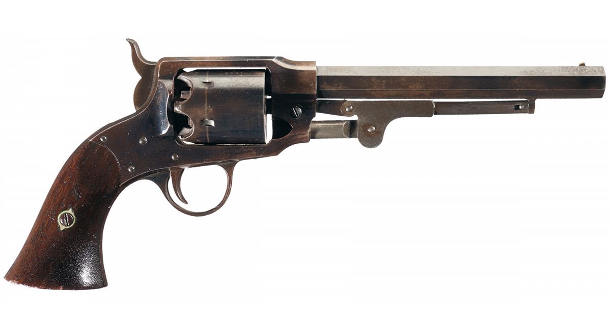 This is an example of one of the approximately 5,800 percussion revolvers manufactured circa 1863-65 by Rogers & Spencer of Willow Dale, New York, (which is near Utica). The U.S. Ordnance contract was for 5,000 revolvers, 1,500 to be delivered by the end of April 1865 and the balance by September of 1865. There is no record of issuance of any of the revolvers, due to the Civil War ending. The top strap is marked "ROGERS & SPENCER/UTICA NY". The matching serial number is marked on the bottom barrel flat, left side of the frame, cylinder and on the butt. There are small single letter "B" and "H" inspection marks on most of the parts, including the bottom of each grip panel. The revolver is finished blue with a casehardened hammer, trigger and loading lever assembly. Brass cone front, frame notch rear sights and fitted with smooth walnut grips with a clear "RPB" cartouche on the lower left panel.