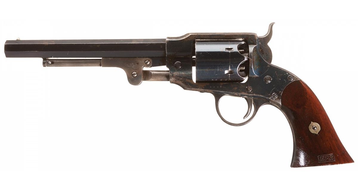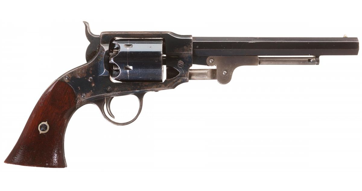 This is an example of one of the approximately 5,800 percussion revolvers manufactured circa 1863-65 by Rogers & Spencer of Willowdale, New York, (which is near Utica). The U.S. Ordnance contract was for 5,000 revolvers, 1,500 to be delivered by the end of April 1865 and the balance by September of 1865. There is no record of issuance of any of these revolvers, due to the Civil War ending. The top strap is marked "ROGERS & SPENCER/UTICA NY". The matching serial number is marked on the bottom barrel flat, left side of the frame, cylinder and on the butt. There are small single letter "B" inspection mark on most of the parts, including the bottom of each grip panel. The revolver is finished blue with a casehardened hammer, trigger and loading lever assembly. Brass cone front, frame notch rear sights and fitted with smooth walnut grips with a sharp "RPB" cartouche on the lower left panel.