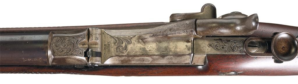 This is a fine example of a very early Type II, U.S. Springfield Armory Model 1875 Trapdoor Officer's rifle. These rifles were considered as a badge of rank and distinction by U.S. Calvary Officer's that had to be purchased directly from Springfield Armory on a special order basis only. There were three different types of rifles, with a total of 477 Officer's Models actually produced for all three types with only 252 total Type II Models manufactured. They all exhibited select walnut stocks, with a checkered wrist and forend area with a separate checkered detachable walnut pistol grip. The receiver, breech block, lock plate, hammer, tang, and barrel band are all decorated with a fine scroll engraving. The left side of the barrel is stamped "V/P/Eagle Head/P" proof and the underside of barrel has a single iron ramrod thimble, and is fitted with a hickory wiping rod with nickel-plated, knurled front ferrule and slotted rear ferrule. The top of the breechblock is marked "U.S./MODEL/1873" in three lines and the lock plate is marked with the "Springfield Eagle/Shield" motif ahead of the hammer followed by "U.S./SPRINGFIELD", surrounded by scroll engraving. The barrel has a Beach front sight that has a combination folding blade/globe with a first pattern Model 1877 rifle rear sight that is marked on the side of the base: 1-4 and on top of the ladder, 6-12. The top of the wrist of the stock has a very desirable type II folding vernier tang sight with the small round base. It is fitted with the two piece trigger plate and trigger guard bow that also has fine engraving and is correctly fitted with a single set-trigger. The rifle is fitted with an oil finished walnut half-stock that is fitted with an engraved German silver squared end forend tip. The end of the butt has a solid steel buttplate stamped with a "U.S." on top of the heel. The left side of the stock is correctly NOT cartouched and there is a single circled script, "P" proofmark behind the checkered panel on the underside of the stock. These rifles all have a blue barrel, color casehardened receiver and components and are fitted with a hickory cleaning rod.