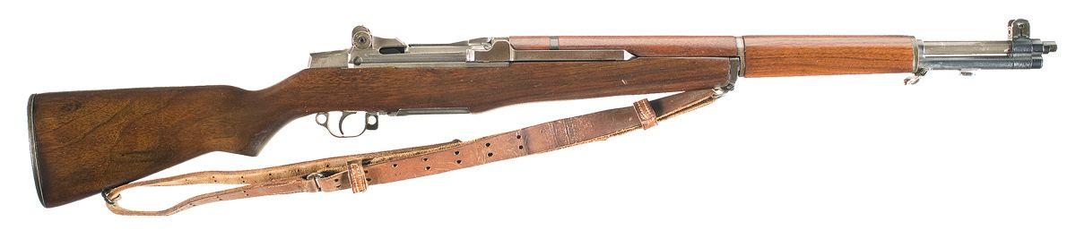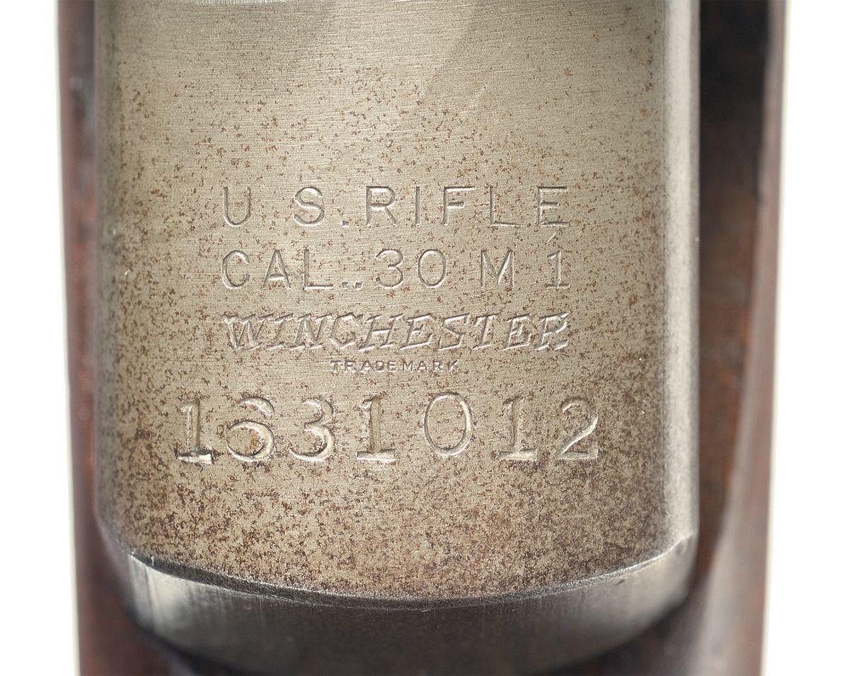 This is an excellent example of a scarce, WWII M1 Garand rifle as produced Winchester Repeating Arms under contract for the US Army. This rifle was produced in the third contract range of serial number in late 1942 to late 1943. It has the standard late gray-green parkerized finish overall with the oil finished stock and hand guards. The receiver has the standard markings of "US RIFLE/CAL .30 M1/WINCHESTER/over the serial number". The right side of the barrel has only a single number 9 with a single circled "WP" proof. The rifle has the correct Winchester marked components (operating rod, bolt, and complete trigger group) and the complete gas cylinder assembly is a post war, wide base version that has the later four groove gas plug marked with a "PX" and a post war set of rear sights. The rifle is fitted with a walnut stock and hand guards and the stock carries a boxed "S.A./SHM" cartouche on the left side with a double "P" circled proof in the piston grip area. It is complete with an unmarked 1907 leather sling with steel keepers, a first model chamber cleaning tool, nickel plated oiler and one small grease tube.